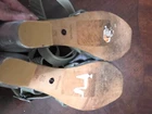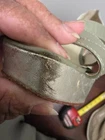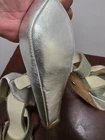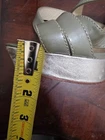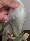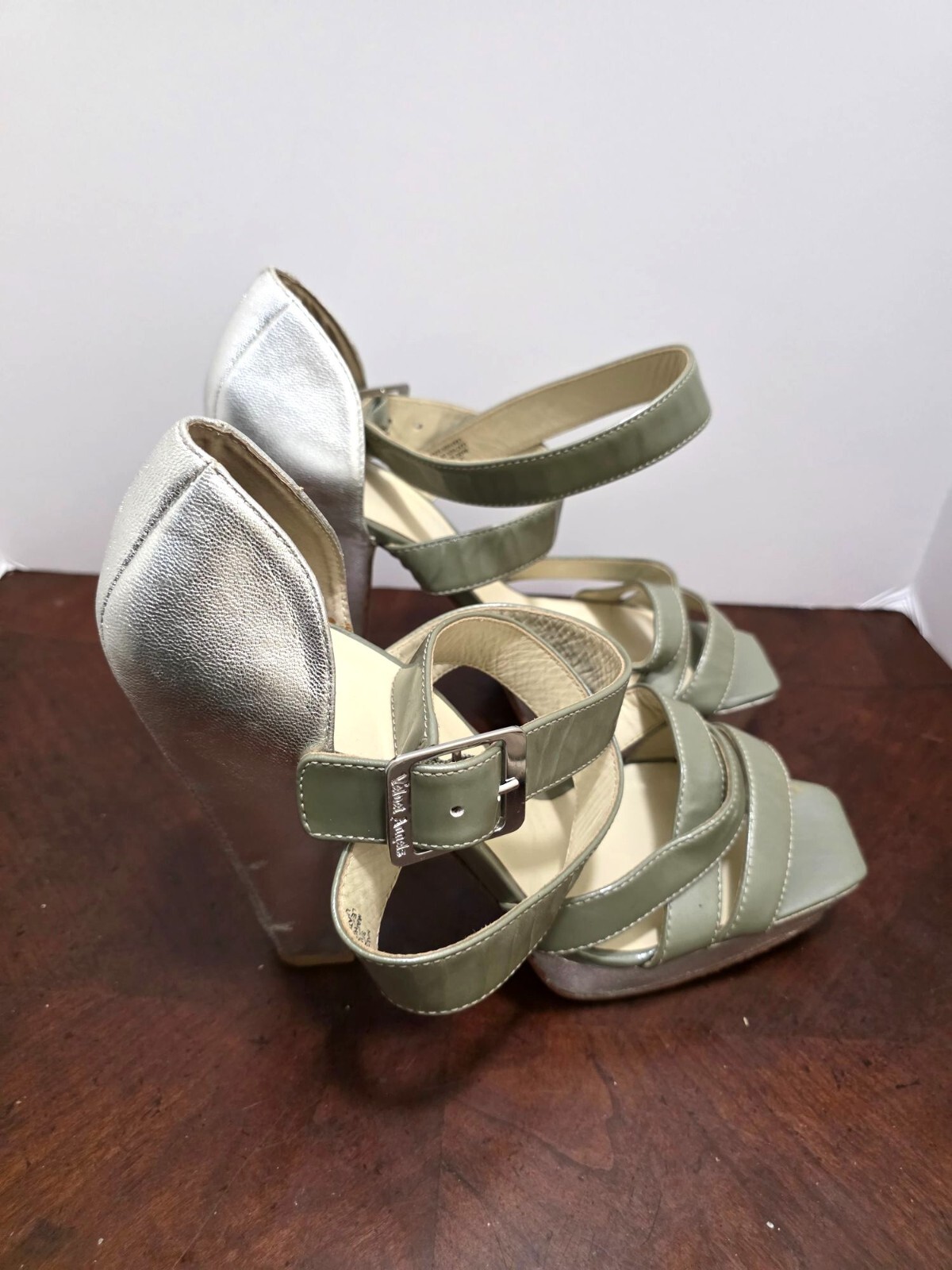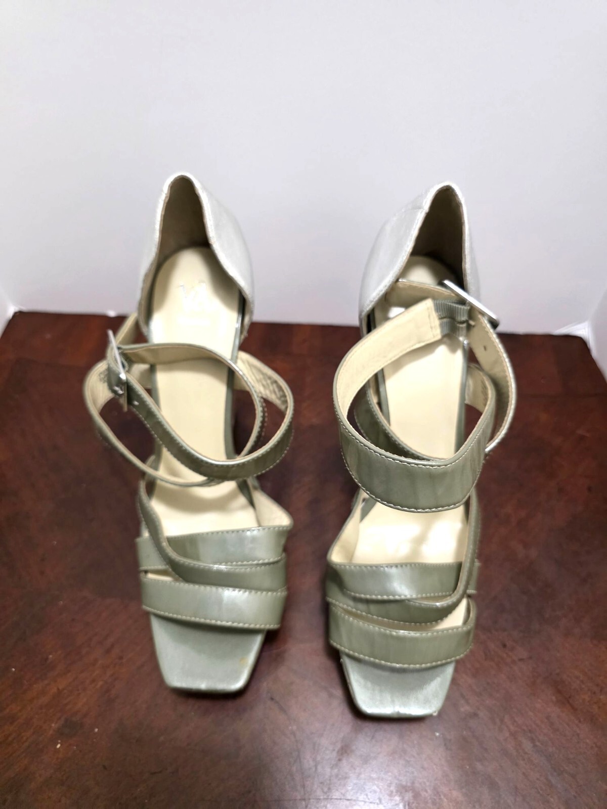Elegant high heel sandals featuring a metallic silver and olive green design, durable straps, and a secure buckle closure. Ideal for stylish occasions. • Adjustable buckle strap for a personalized fit • Square toe design for added comfort • Metallic accents for a modern look • Durable high heels for stability • Lightly cushioned insole for support Heel height 5 inches CONDITIONS pre owned, Minor scuffs on soles; adhesive residue visible, good conditions. see photos for flaws details.