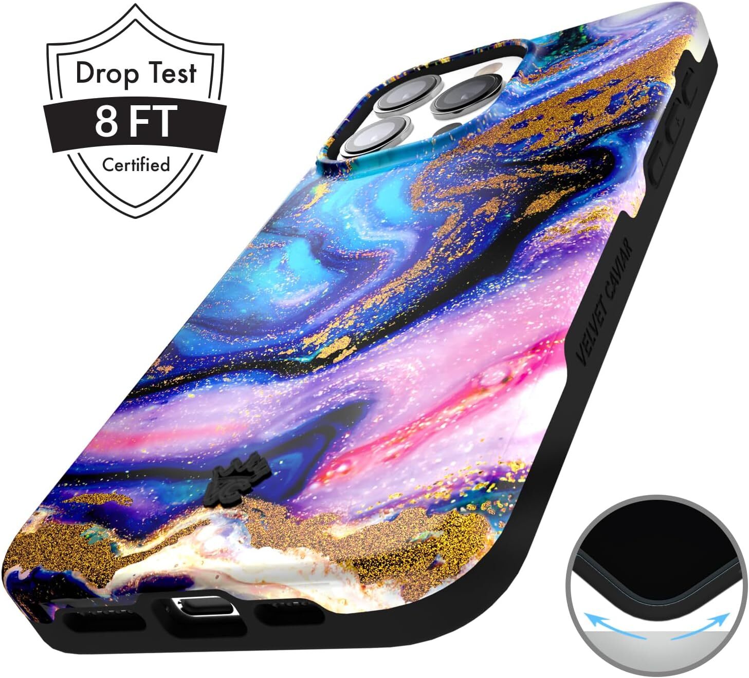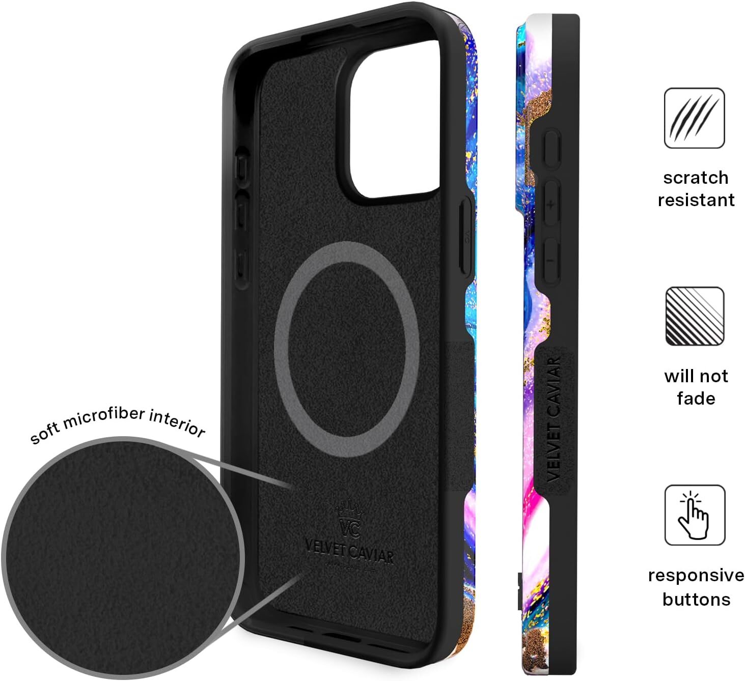 Velvet Caviar Case Compatible with iPhone 15 PRO 15 Pro Max, Galaxy Glitter Product Details Package Dimensions: 8.03 x 4.29 x 0.79 inches Item Weight: 2.99 ounces Item model number: 2023-microfibers Special features: Slim Fit, Heavy Duty Protection, Magnetic, Shockproof, Wireless Charging Compatible Other display features: Wireless Form Factor: Basic Case Color: Galaxy Glitter Manufacturer: Velvet Caviar Country of Origin: China Brand: Velvet Caviar Compatible Phone Models: iPhone 15 Pro Max Material: Thermoplastic Polyurethane COMPATIBILITY: Compatible with iPhone 15 Pro Max (6.7" display), case will NOT fit any other model DESIGNED IN NYC: Join 1+ million social media fans who love our Pretty yet Protective cases featuring designs hand drawn by our New York City artists since 2014 PREMIUM QUALITY: Using the highest grade materials and laser printing technology to deliver a stunning design with the quality & protection you can count on; we invite you to experience the Velvet Caviar difference TOTAL PROTECTION: Full body shockproof FirmFlex case defends against drops with a soft TPU bumper and a hard PC plate, along with raised bezel edges for screen and camera coverage