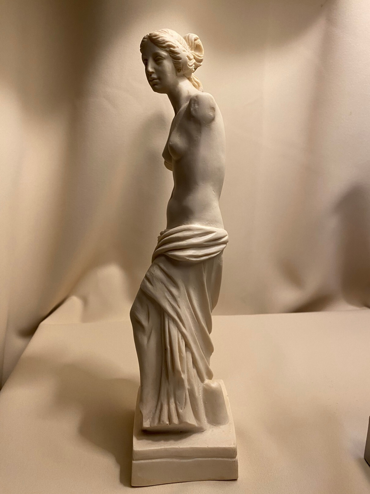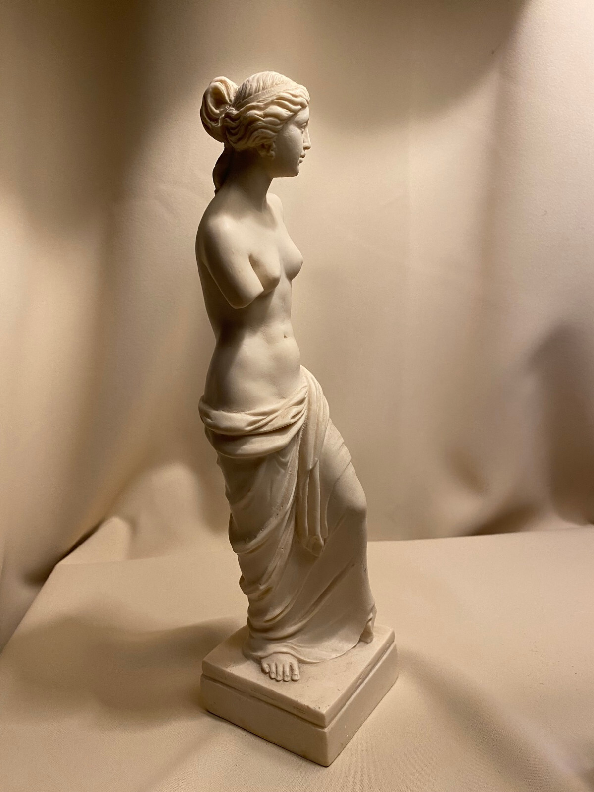 The "Venus de Milo" figurine sculpture stands at 11-1/2 inches tall including the base. The statue is of medium size and has an alabaster color, depicting a figurative art style of the Greek goddess Venus. The sculpture is a representation of classical art and would make a stunning addition to any art collection or display. The base measures 3" square and 1" high and weights 1 lb 13 oz.