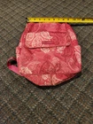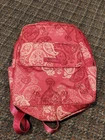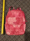 This Vera Bradley Canvas Backpack in a medium size is perfect for any occasion whether it be travel, casual, workwear or business. The backpack features a rectangular shape with a quilted finish and double straps for comfortable wear. The pink exterior color with silver hardware adds a touch of elegance to the design. The backpack is lined with cotton and fabric and includes inner pockets, outer pockets, an organizer, and a laptop sleeve for added convenience. The backpack is also lightweight, eco-friendly, and includes a mobile phone pocket, bottle pocket, and limited edition design. This backpack is a must-have for any Vera Bradley fan and is perfect for everyday use. Bag is used and has ware as shown.
