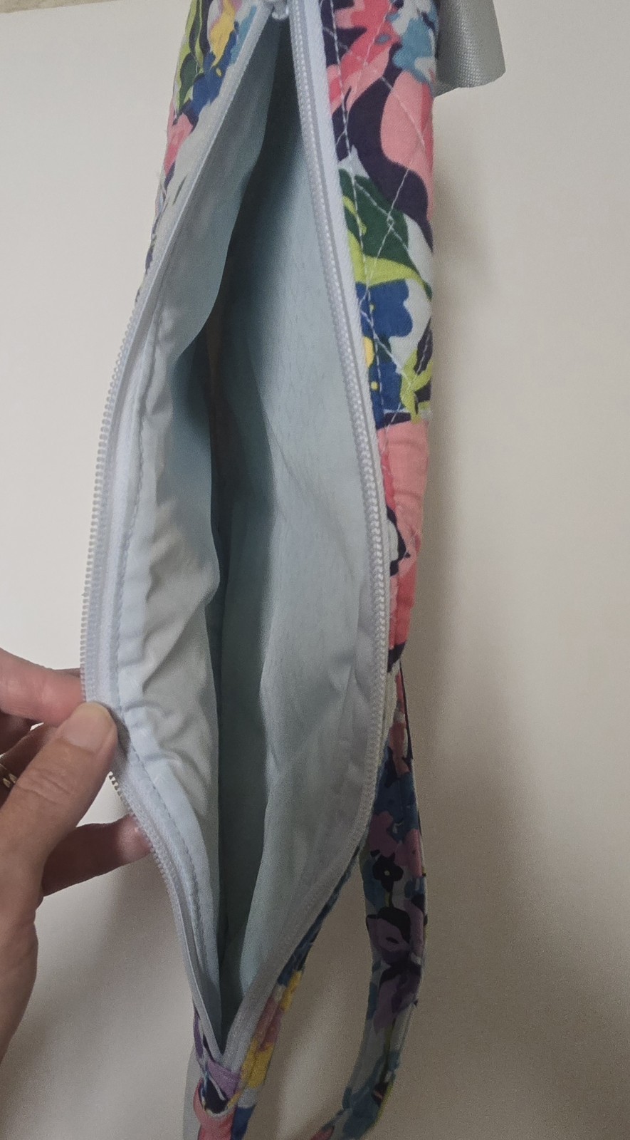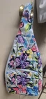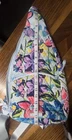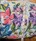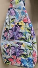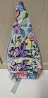 The Vera Bradley Essential Sling Backpack in the Marian Floral Pattern is a medium-sized backpack with a unique shape and a colorful floral pattern. It features a zip closure, blue cotton handles/straps, and blue plastic hardware. This backpack is perfect for travel and casual occasions, with adjustable straps and pockets for added functionality. The exterior is made of cotton knit fabric, with a blue fabric lining. The Vera Bradley brand is known for its colorful and stylish designs, making this backpack a fashionable and practical choice for women on the go. Only used once!