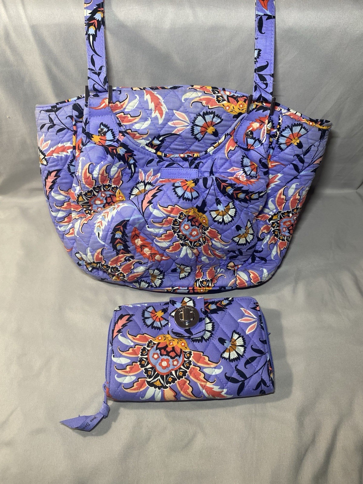 The Vera Bradley Glenna Purse and Matching Wallet Set in Mural Garden design is a stylish shoulder bag with a zip-top closure and dual straps for easy carrying. Made of cotton microfiber fabric with a quilted finish, this medium-sized bag features floral pattern and silver hardware accents. The bag includes multiple pockets for organization and a brand card accessory. Perfect for everyday use, this multicolor bag is designed by Vera Bradley, featuring a unique medallion theme and a comfortable cotton lining.
