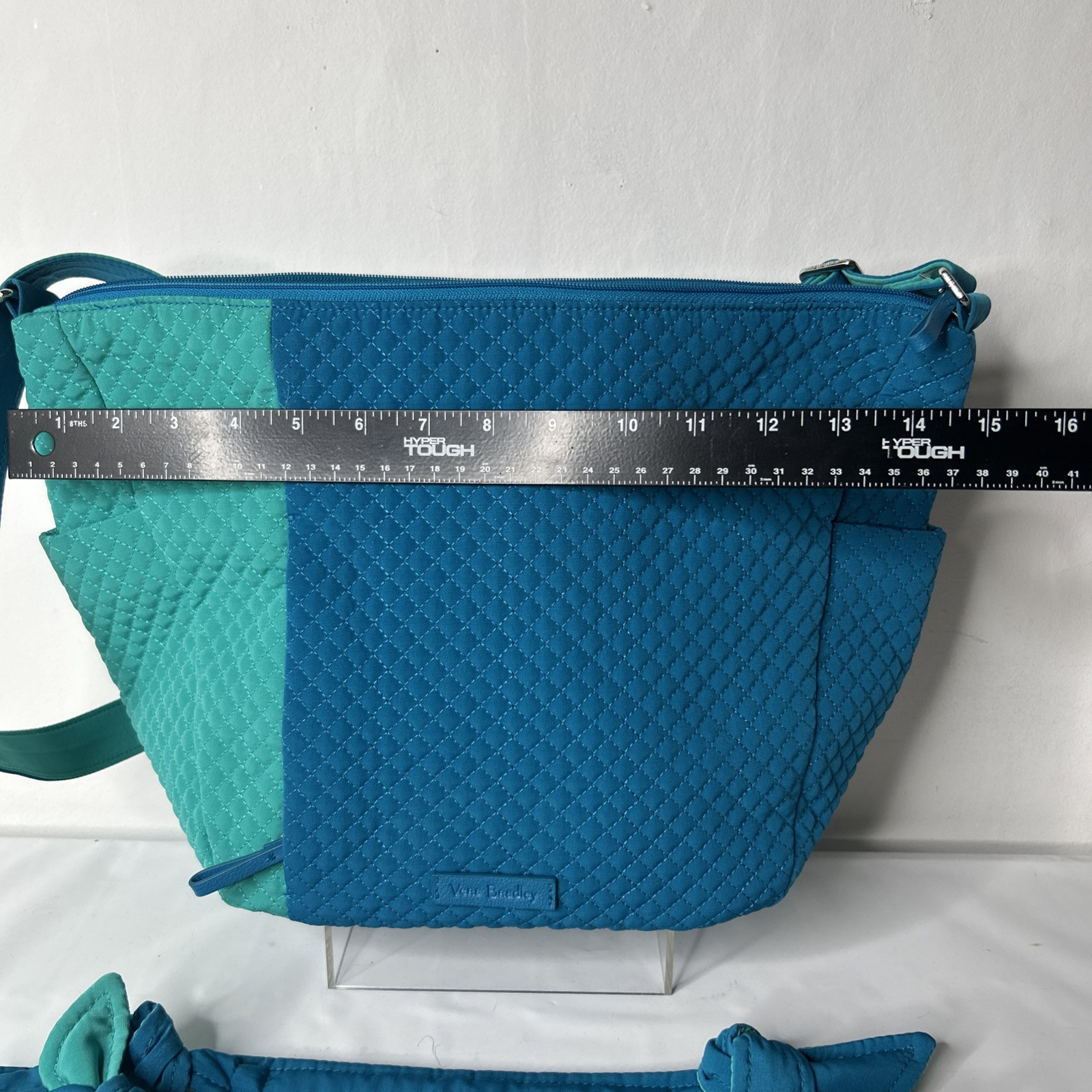 The Vera Bradley Hadley On The Go Satchel is a stylish women's purse in a vibrant turquoise color. Made of microfiber material, this satchel features a solid quilted pattern and a zip closure for security. The Vera Hadley model offers a chic satchel/top handle style, perfect for everyday use. The ties in the sides came off and I liked it better without them but they are included with the purse. Excellent condition.
