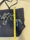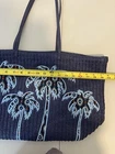 This Vera Bradley tote bag is the perfect accessory for any summer outfit. The navy blue exterior with white palm tree pattern adds a beachy, boho vibe to your look. The bag measures 19 inches in width, 12 inches in height, and 7 inches in depth, making it a spacious option for carrying all your essentials. The bag features an open closure and a black handle/strap color that complements the overall design. The hardware color is white and black, which also adds a touch of elegance to the bag. The tote bag is made of soft wicker-like feel material and lined with black, making it easy to find your belongings. This bag is part of the Verra Bradley product line and is specifically designed for women.