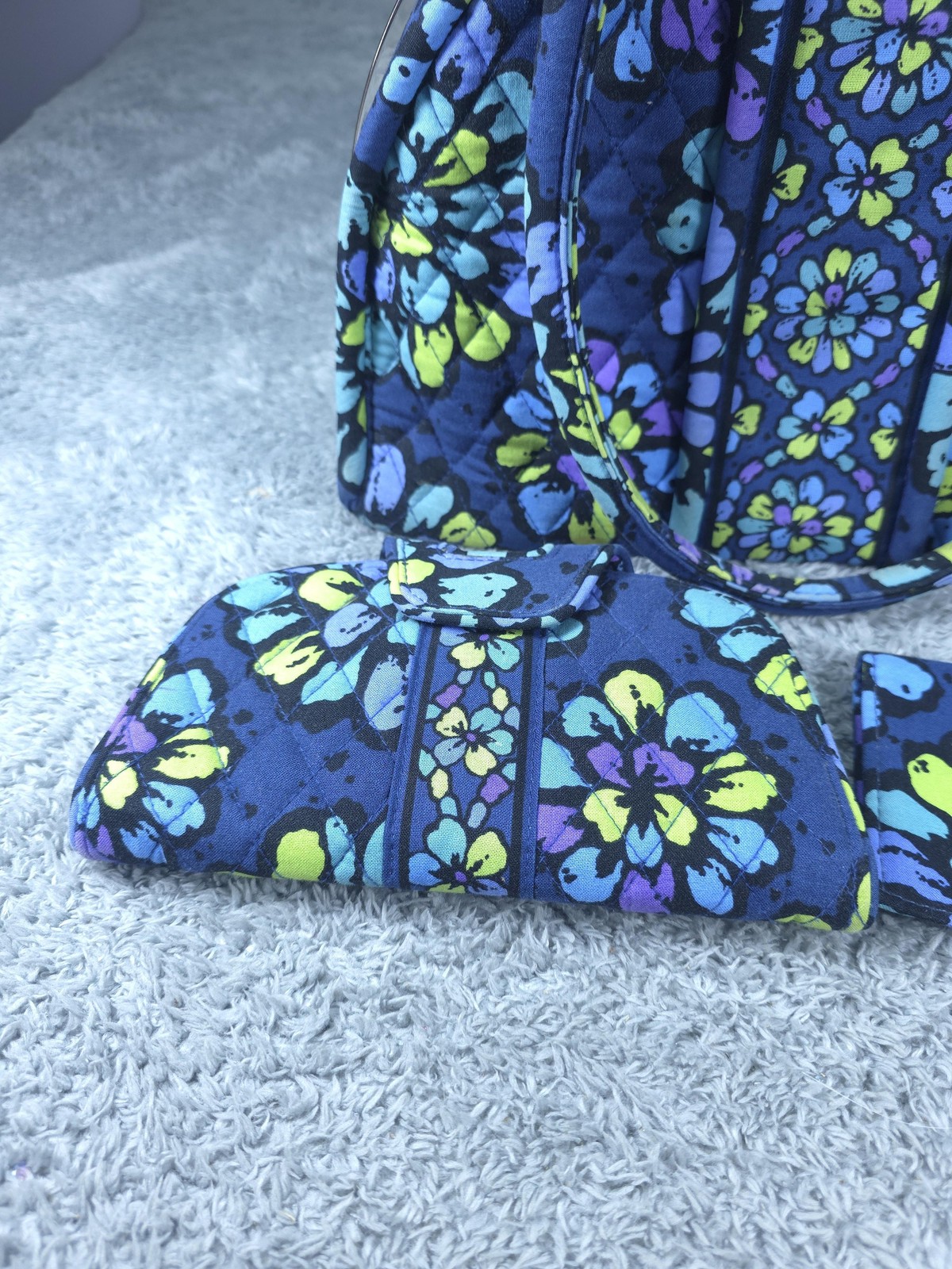 Vera Bradley Quilted Purse Wallet Set Womens Blue Floral Bag Coin Cosmetic Case Condition: Gently worn, no visible flaws. Fabric is clean, hardware and stitching intact. No noticeable stains or damage inside or out. This set includes a Vera Bradley quilted handbag with a kiss-lock closure, matching snap wallet and coordinating fabric card case. Features a vibrant blue, purple, green, and yellow floral pattern throughout, with branded fabric tags visible inside and outside (see photos). The wallet has an ID window, multiple card slots, and signature Vera Bradley lining, all in clean, excellent condition. The inside of the purse features coordinating blue and multi-color patterned lining, a zipper pocket, and slip pockets for organization. Perfect for everyday use, travel, or as a gift. Classic Vera Bradley quilted cotton construction ensures lightweight durability. Pattern: Blue, purple, green, and yellow floral Includes: Quilted purse, matching wallet, and coordinating card case Brand: Vera Bradley Stylish, classic floral print in signature Vera Bradley quality Item is in gently used pre-owned condition. Item may contain normal signs of wear, blemishes, discoloration, creases and/or other signs of distress. Photos depict the exact item you will receive. Please refer to photos for full details prior to purchasing. Items are cleaned in accordance with eBay's standards and policies. Fast Free USPS Shipping - 30 Day Returns - Hats Ship in a Box