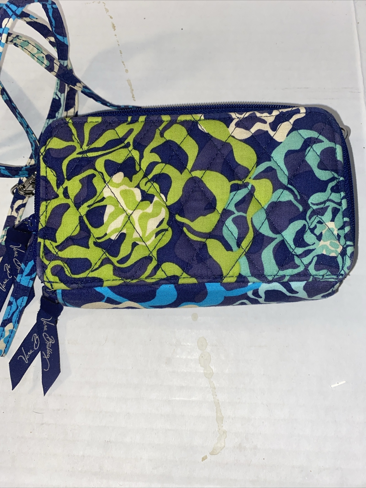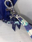 This Vera Bradley wristlet purse in Katalina Blue is the perfect accessory for any occasion. With a zip and snap closure, your belongings will stay secure while you're on the go. The multicolor handle/strap adds a pop of color to the stylish quilted fabric exterior. The interior is lined in blue and has plenty of space for all your essentials. The hardware is silver, adding to the overall chic look of the wristlet. The versatile style makes it suitable for travel, weddings, parties, casual and formal events, workwear, and business meetings. Don't miss out on this retired beauty!