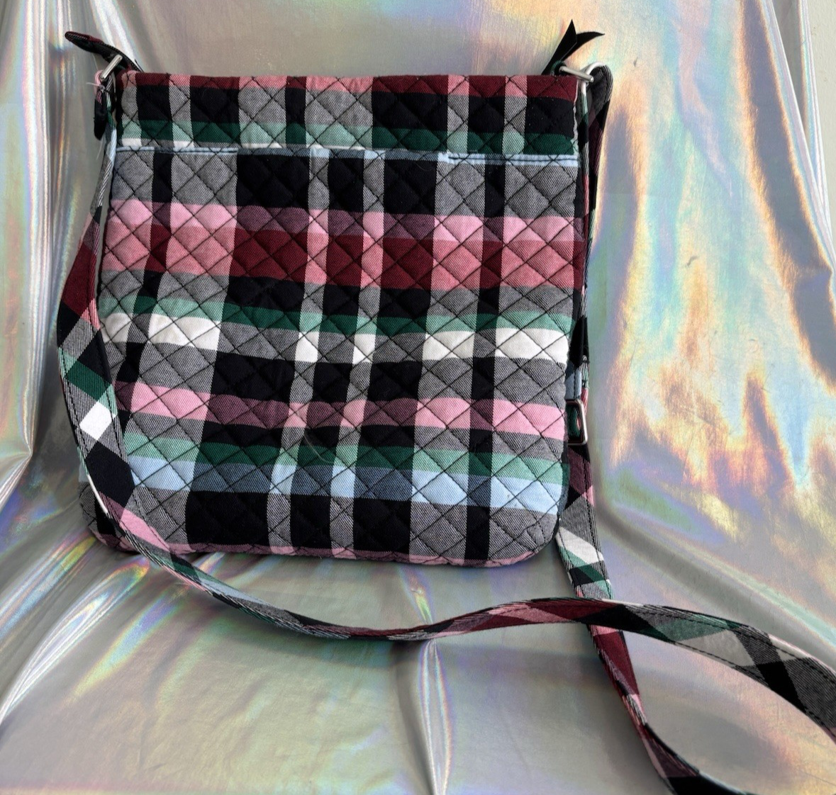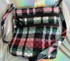 This Vera Bradley Ribbons Plaid cross-body shoulder bag is a beautiful and stylish accessory for women. Made from cotton with a zip closure, it features a plaid pattern in a stunning exterior, complemented by black and white floral lining. Perfect for carrying your essentials with ease and adding a pop of color to any outfit. 11" wide x 11" high, adjustable cross-body strap. Three outside pockets, one large zippered inside pocket. Excellent previously owned condition.