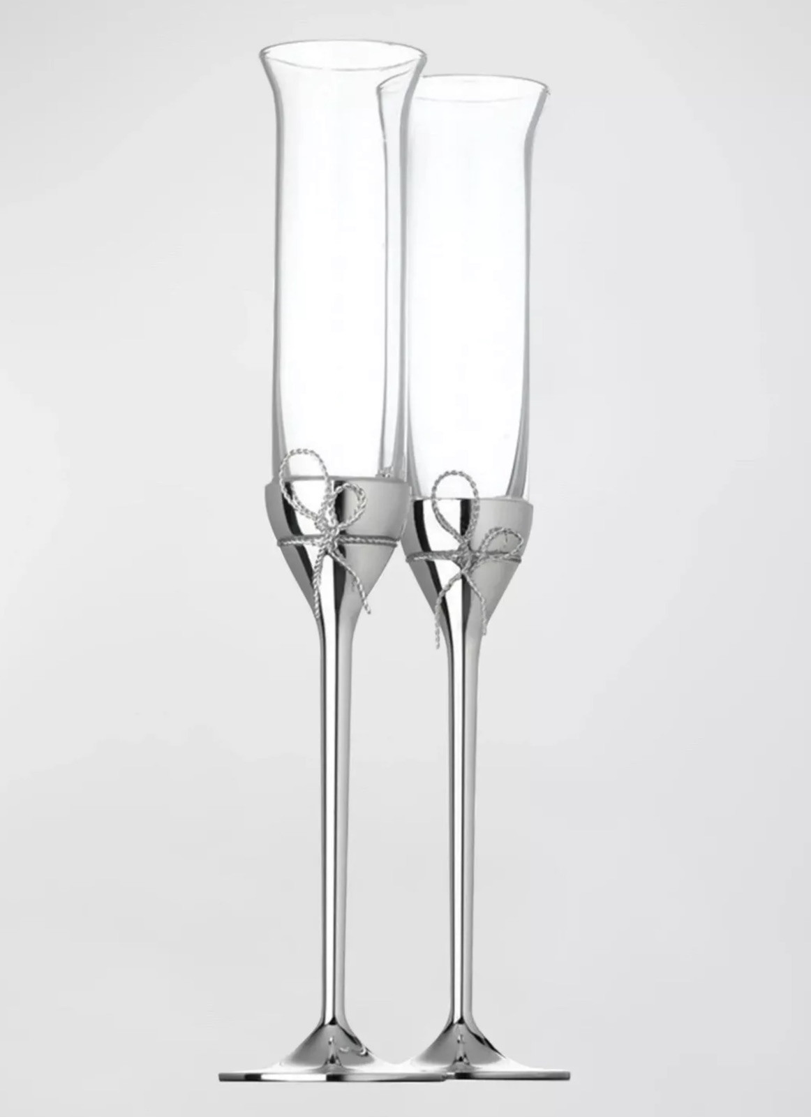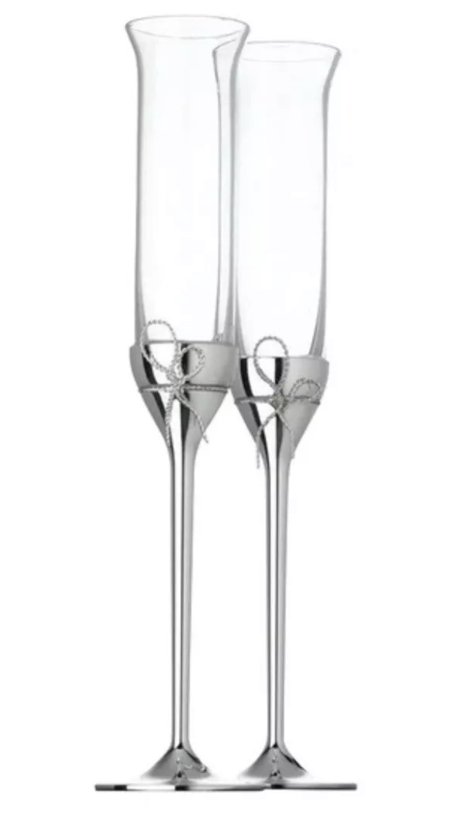 This pair of Vera Wang silver Love Knots Toasting Champagne Flutes is the perfect addition to your wedding or special occasion. The round, contemporary shape and silver color make them a stylish and elegant choice. Made of high-quality crystal, these flutes are designed to enhance the taste and aroma of your favorite champagne. The set includes two flutes and is ideal for a couple. They come in a box for easy storage and transport. Hand wash only to keep them looking their best. Add a touch of sophistication to your special day with these exquisite Vera Wang Love Knots Toasting Champagne Flutes. New with out box ! Stunning !