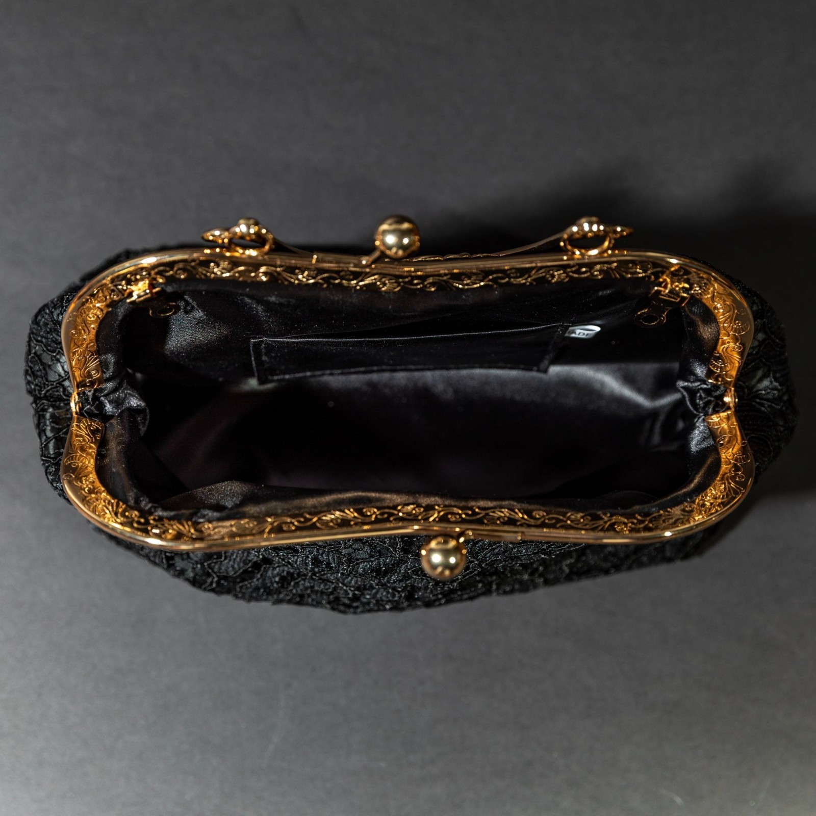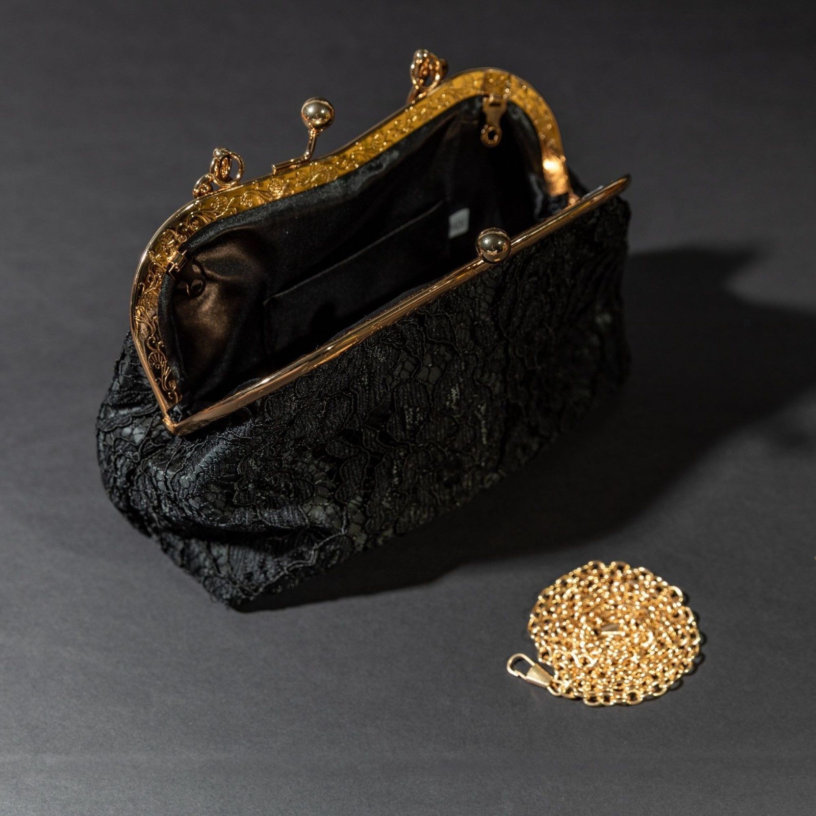 The Verano Hill Vintage Lacy Bag in Black exudes timeless elegance with intricate lace detailing and an ornate gold frame. Its floral-engraved clasp and matching gold chain elevate its vintage charm, while the soft satin interior adds a luxurious finish. Perfect for evening wear, formal occasions, or vintage-inspired outfits. • Brand: Verano Hill • Condition: NWOT • Color: Black with Gold Hardware • Materials: Lace Overlay, Satin Lining, Metal Frame • Size: Approx. 8.6" x 3" x 6.3" (LxWxH) • Type: Clutch / Evening Bag • Includes: Detachable gold chain strap A romantic statement piece that pairs effortlessly with gowns, cocktail dresses, or tailored evening looks.