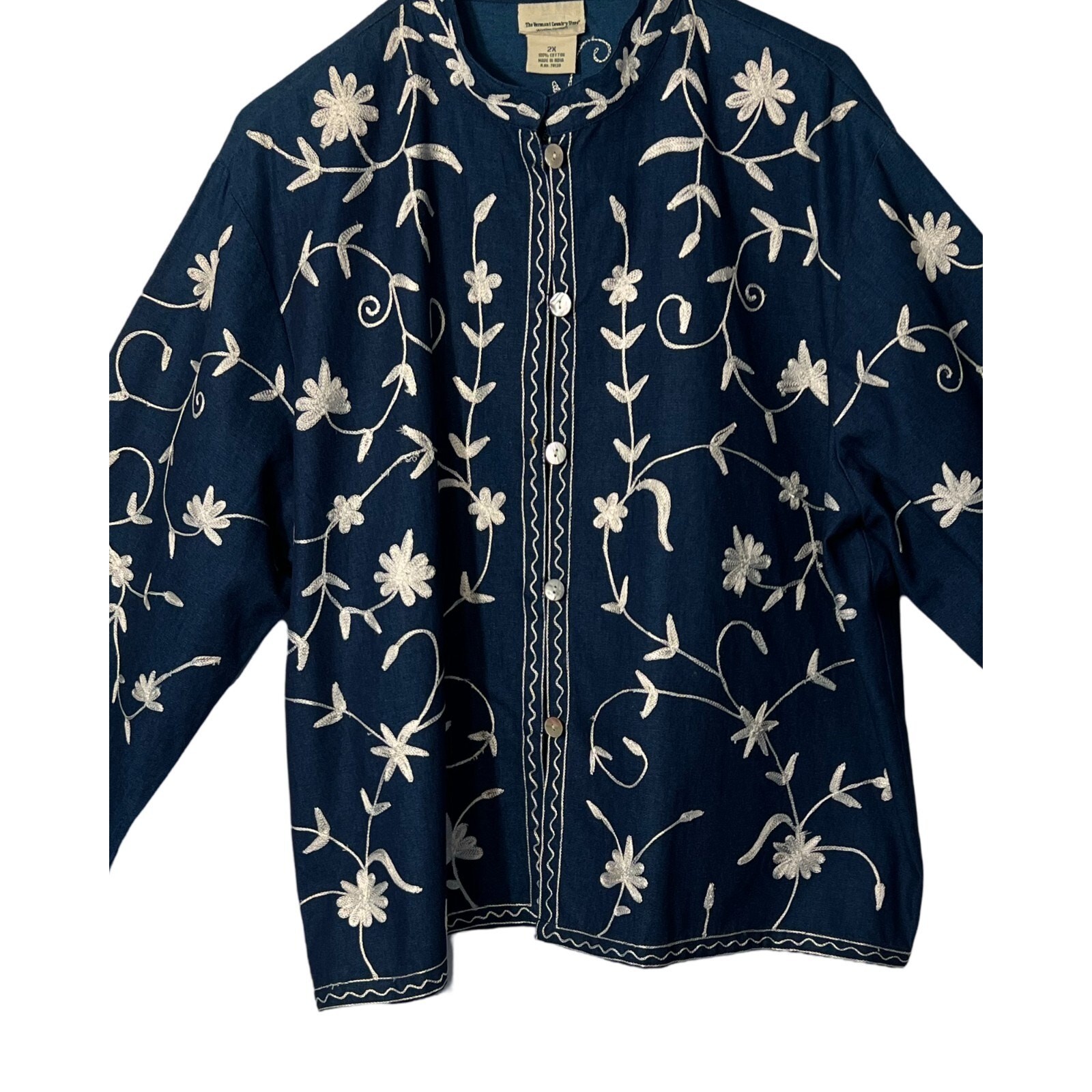 26" armpit to armpit 19" shoulder to shoulder 24" sleeve 25" length excellent condition Vermont Country Store Top Women's Plus Size 2X * comfort * relaxed-fit * breathable * delicate floral pattern with intricate embroidery, * blue * long-sleeve * button-up * 100% cotton * machine washable * crew neck * casual sleeves ** all items stored in smoke-free pet-free home