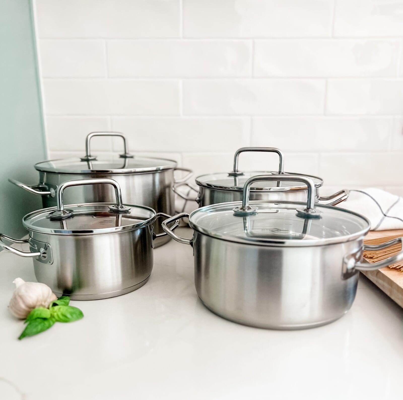 8-PIECE SET: This 8-piece set includes the following: 1-1.85 qt pot (6” x 3.5”) with lid, 1-3.7 qt pot (8” x 4.5”) with lid, 1-6.3 qt pot( 9.5” x 5.3”)with lid, and 1-3.2 qt pot(8” x 3.7”) with lid. These pots are made of 100% 18/8 stainless steel and each feature 2 comfortable oversized handles for easy lifting. For further convenience and precision, there are graduated ml markings on the inside of the pot. Each lid is designed to with safety glass and stainless steel handles. PROFESSIONAL GRADE: This set of 4 pots and lids are perfectly balanced and weighted with a comfortable, sturdy, and durable handle. Whenever you use our Verona Stainless Steel 8-piece pot set with clad bottom, you become a chef in your own kitchen. They have been designed to the highest quality standards with a clad bottom base and a welded handle. Stainless steel cookware doesn't get any better than this. The pots and lids are so well designed that you will be inspired to try new recipes often and without fuss! SUITABLE FOR ALL COOKTOPS: has the right cookware for every dish. High quality stainless steel provides cooking pleasure at the professional level. Whether you are steaming vegetables or heating soup stock for your latest recipe, these are the perfect cooking pot to use when prepping your next recipe. cookware is suitable for any stovetop, including gas, electric, and induction. Dishwasher safe. VERSATILE AND CONVENIENT: This dishwasher safe, stainless steel cookware is extra easy to clean. When quality cookware is this easy to care for, there's nothing stopping you from melting, boiling, or heating up any small batch recipe your imagination can dream up! TRADITION OF QUALITY: was founded in Germany in 1923. Designing top-tier items has distinguished this brand as one of the best in the industry. They strive to bring imagination and creativity to the home cook's kitchen and to enhance your overall cooking experience. Frieling has partnered with this brand since 2017 and proudly brings its premium quality hand tools, salt and pepper mills, and more to the US market.