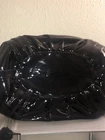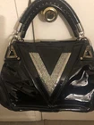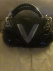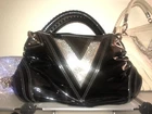 Versace Vintage Patent Leather Crystal V Bag!!! Black Patent Leather Snap closure has 3 compartments with the middle one zipped/Silver hardware Dazzling Large Crystal V on Front Approx measures W 16.5” H 7.9” D 10.5” This Vintage and Rare bag is in Very Good/excellent condition!