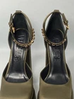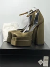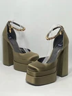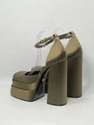Versace Satin Platform Pumps size 40. Marks on the bottom sole from trying on, light scratch on the inner side of the left shoe as shown in the picture. Come with box and dust bag. Size 40 Retail for $1475 Chunky block heel and stacked platform elevates these satin-covered pumps, detailed with crystal embellishments and Medusa charm at ankle strap. Satin upper Square toe Adjustable ankle strap Leather lining Leather sole Made in Italy Satin-covered block heel, 6" (155mm)