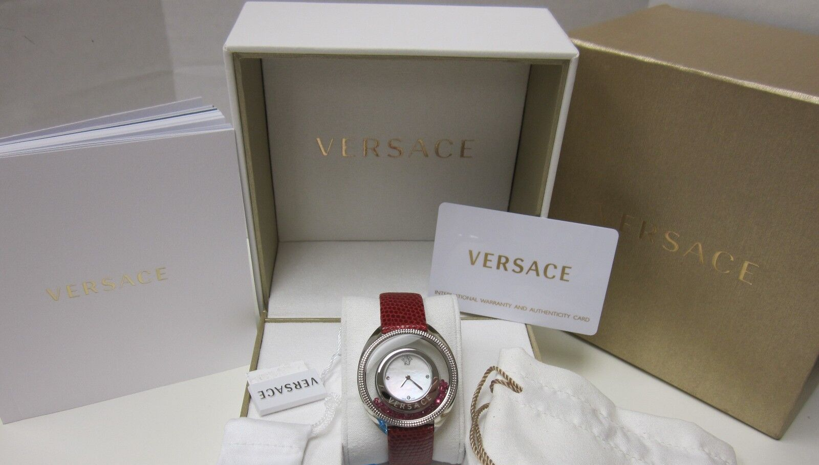 Features Mother of pearl dial and 3 round full cut 1.6mm diamonds in prong settings and 70 round 1.2-1.8mm rubies loose. Diamond color grade is H-I and clarity grade is I1. Stainless steel case Anti reflective sapphire crystal Mother of pearl dial and 3 diamonds on indices ct. 0,015 70 Rubies in see through bezel; Genuine red lizard band Water resistant to 99 feet (30 M): All of the watches sold here are in perfect working order and shipped with original box and documentation. All watches sold here are come with the manufacturer's warranty card. RETAIL: $3,790.00 Comes with original box and papers. This watch is Brand new, never used or worn. WATCH DESCRIPTION: Model number 86Q971MD497 S800 Part Number 86Q971MD497 S800 Item Shape Round dial Anti reflective Sapphire Display Type Analog Clasp deployment Case material Stainless Steel Case diameter 39 millimeters Case Thickness 10 millimeters Band Material Lizard leather Band length Women's Standard Band width 18 millimeters Band Color Red Dial color Mother of pearl Bezel material Stainless Steel bezel Stationary Item weight 16.01 Ounces Movement Swiss Quartz Water resistant depth 99 Feet Additional Features: This watch comes packaged in original watch box with instruction and warranty card. ~Measurements are approximate~ INTERNATIONAL BUYERS NOTE: TIMELESS WATCH OUTLET DOES NOT TAKE RESPONSIBILITY FOR DUTIES, LOCAL TAXES OR ANY OTHER IMPORTATION FEES. Customer Satisfaction is our goal! We try to maintain high standards of excellence and strive for 100% customer satisfaction! All our products are carefully inspected before listed and shipped. Feedback is very important to us. We request that you contact us with your issues immediately or before you give us negative feedback, so that we can satisfactorily address your concerns. It is impossible to address problems if we do not know about them! Please make sure you give us enough time to respond before opening a case. 590rv