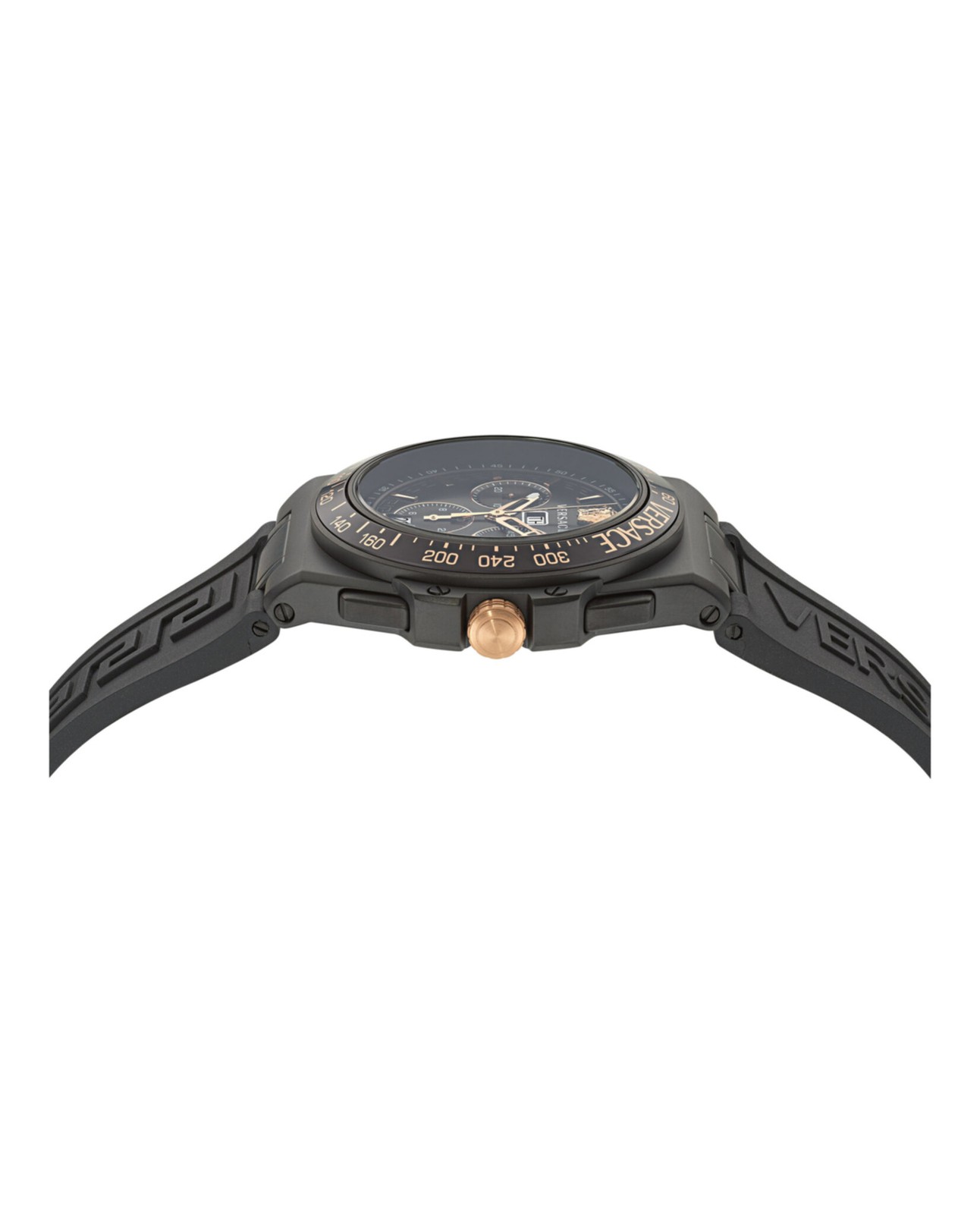 Versace Mens Greca Extreme Chrono Black 45mm Strap Fashion Watch Our eBay Store Versace Greca Extreme Chrono Silicone Watch 45mm IP Black Case Black Black Sunray Dial 5 ATM Deployant Buckle We know you will love your new items. If you are not completely satisfied with your purchase, you have 30 days to submit a return