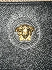 VERSACE Grained Calfskin La Medusa Pouch Black and gold hardware removable wristlet this pouches in new light condition. No signs of where there is a tiny scratch on the medusa nose you could barely see it. Msrp $1195 This is an authentic VERSACE Grained Calfskin La Medusa Pouch in Black. This chic wrist pouch bag is crafted of grained calfskin leather in black. The bag features a polished gold Medusa medallion and a removable black leather wristlet strap, and a gold top zipper that opens to a black monogram jacquard fabric interior with a zipper pocket. Does not include dust bag or box This Versace Medusa Zip Pouch Wristlet is a stylish and sleek accessory for any woman. Crafted from high-quality black grained calfskin leather, this wristlet features a zip closure and a versatile wristlet strap for easy carrying. The classic Versace Medusa logo adds a touch of luxury to this beautiful piece. The interior of the wristlet is lined with soft black leather and fabric, and includes inner pockets for storing small items. The gold hardware gives the wristlet a sophisticated look, while the black exterior color makes it easy to match with any outfit. This wristlet is perfect for those who want to add a touch of elegance to their daily routine.
