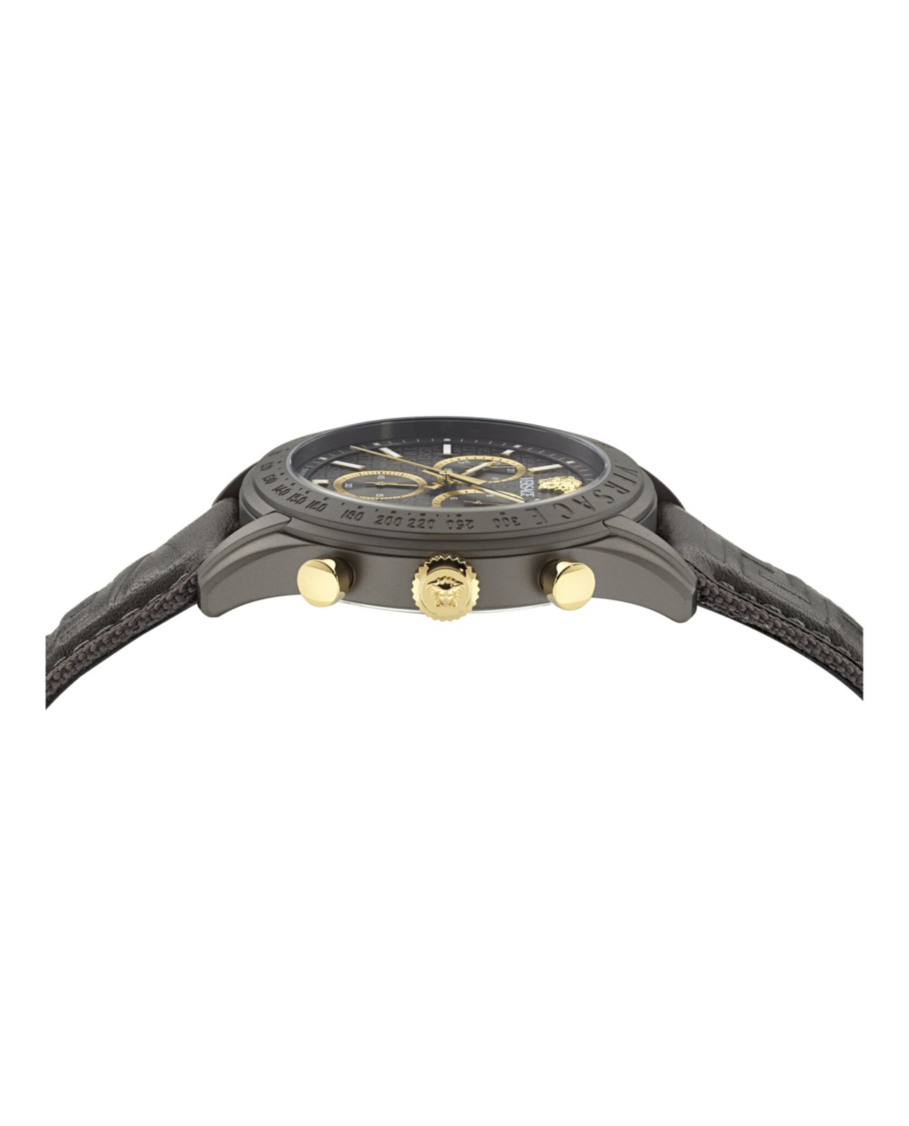 Versace Mens Gun 44mm Strap Fashion Watch Our eBay Store Versace Chrono Master Leather Watch 44mm IP Gunmetal Case Grey Calf Leather Strap Grey Guilloche Dial 5 ATM Ardillon Buckle We know you will love your new items. If you are not completely satisfied with your purchase, you have 30 days to submit a return