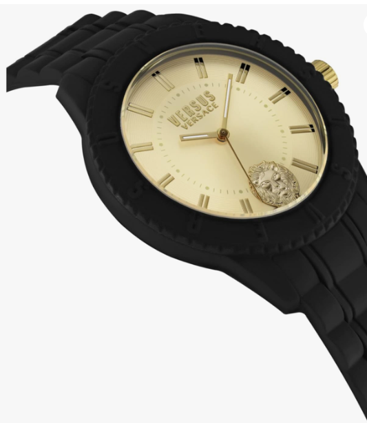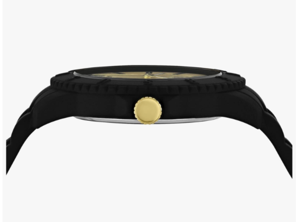Case Size Diameter 42mm in Black Tone Black Case Black Silicone Strap with Ardillon Closure Gold with IP Yellow Gold details Enamel Dial Luxury Fashion Watch with 3 Hand Quartz Movement AZ