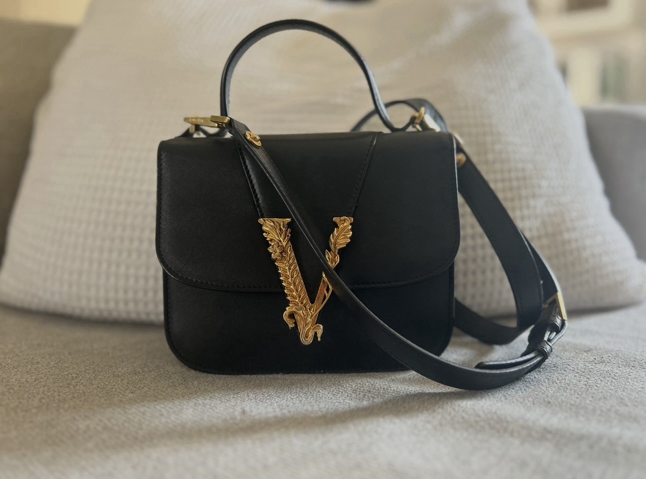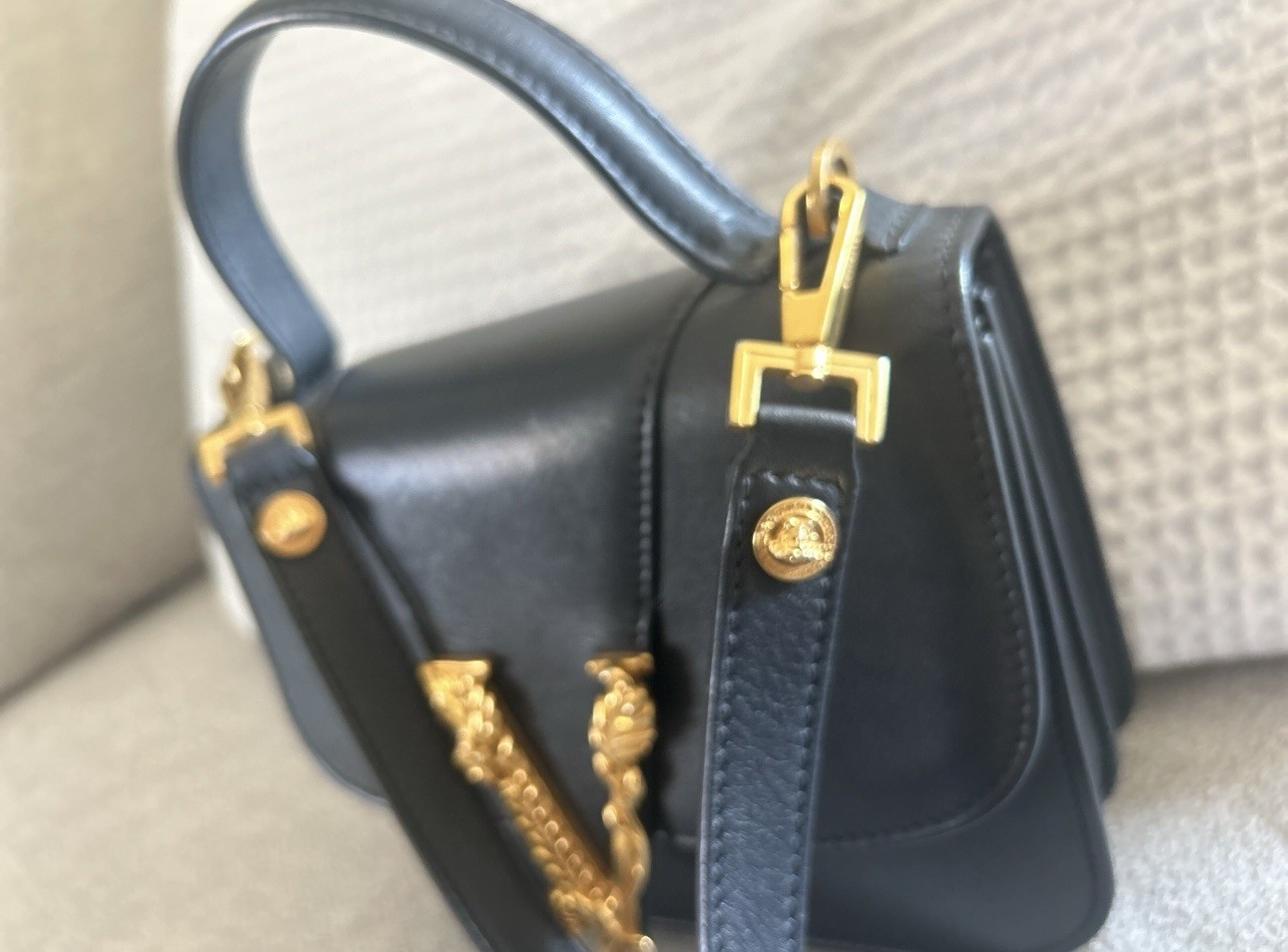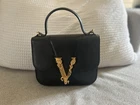 Versace Virtus Small Top Handle Bag – Black Leather – Gold V – MSRP $1,450 Condition: Excellent – Worn Twice Brand: Versace Model: Virtus Top Handle (Small) Color: Black Material: Smooth Calf Leather Hardware: Gold-tone Made in Italy ⸻ 📄 Description Authentic Versace Virtus Small Top Handle Bag crafted from smooth black calf leather and finished with Versace’s iconic gold Virtus “V” baroque emblem. This bag has been worn only twice and remains in excellent condition, with clean leather, structured shape, and light, normal wear consistent with minimal use. A timeless, elegant silhouette that can be worn top-handle or crossbody with the detachable strap. Comes from a smoke-free home and has been stored carefully. ⸻ ✨ Features • Smooth calf leather exterior • Structured top-handle silhouette • Signature gold Virtus “V” hardware • Detachable & adjustable shoulder strap • Magnetic flap closure • Interior slip pocket • Versace logo stamp interior • Made in Italy craftsmanship ⸻ 📦 Included • Versace Virtus handbag • Detachable shoulder strap • Versace dust bag • Authenticity / care cards (as shown) ⸻ 📏 Approximate Measurements • Width: ~7.5 in • Height: ~6.5 in • Depth: ~3 in (Perfect size for phone, wallet, keys, and essentials) ⸻ 🚚 Shipping • Ships securely with care • Fast handling time • Signature confirmation recommended