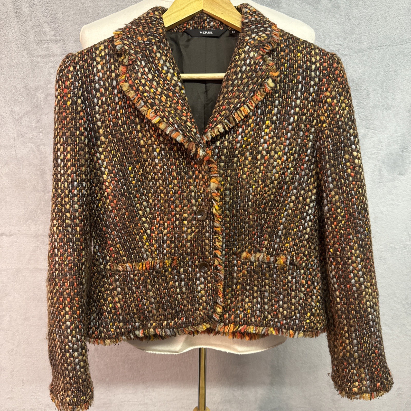 This Verse Boucle Wool Mix Ladies Jacket in size UK 10 (Euro 38) is a stylish and colourful addition to any autumn wardrobe. The jacket features a regular fit and is designed for women who appreciate both fashion and comfort. With its autumnal theme and high-quality materials, this jacket is sure to keep you warm and looking stylish during the colder months. Perfect for adding a pop of colour to your outfit while staying on-trend with its mix brand and unique design. Excellent condition