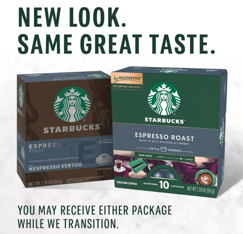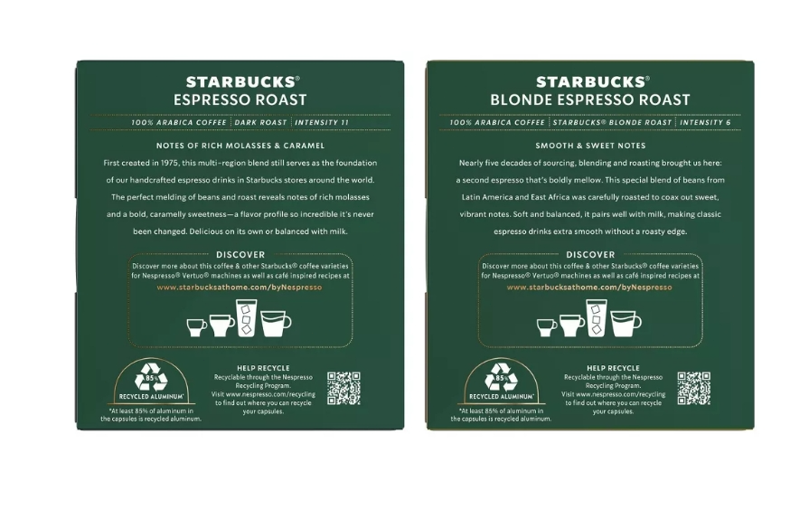 Enjoy the authentic café taste of Starbucks coffee at home like never before on Nespresso Vertuo Machines. Made with the premium quality Starbucks coffee that you know and love, Starbucks capsules are developed with Nespresso to work perfectly with the Nespresso Vertuo system and are fully recyclable through the Nespresso recycling program. Starbucks Espresso Roast has notes of rich molasses and caramel, while Starbucks Blonde Espresso Roast features smooth and sweet notes. Both are perfect for making oh-so-delicious espresso drinks. Each precision-brewed Starbucks coffee is made with 100% arabica coffee beans. Authentically delicious perfection is just a cup away. Nestlé uses Starbucks trademarks under license. NESPRESSO is a registered trademark of Société des Produits Nestlé S.A., Vevey, Switzerland. NET WT 2.39 OZ (68 g) each