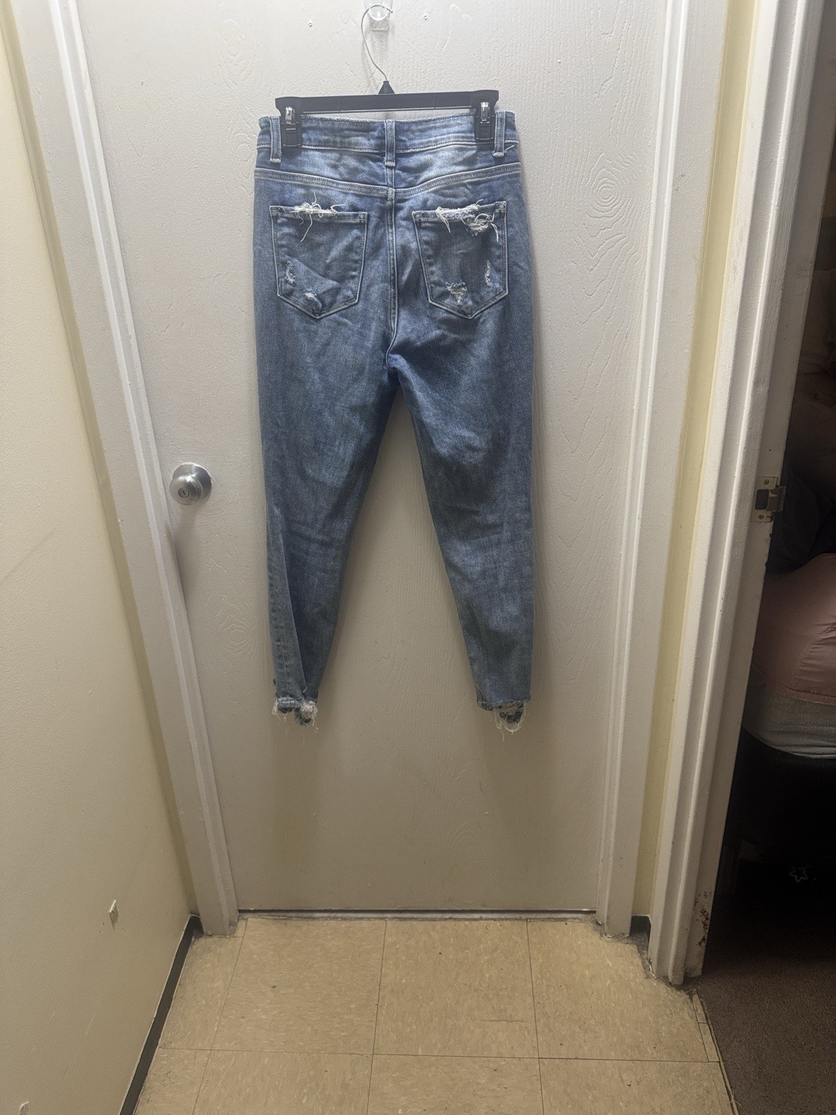 The Vervet Women's Size 28 Button Fly Distressed Ripped Ankle Skinny Denim Blue Jeans offer a stylish and versatile addition to any wardrobe. Made with a blend of polyester, spandex, and cotton, these jeans feature a mid-rise fit with a 27-inch inseam. The distressed detailing and ankle rip add a trendy touch to the classic blue color, making them suitable for year-round wear. With a 5-pocket design and stretch fabric, these jeans combine comfort and style for a fashionable look.