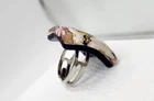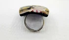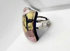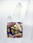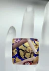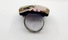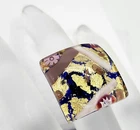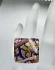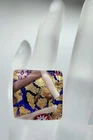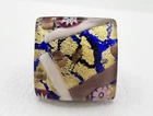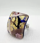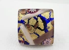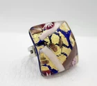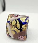 This is a wonderful Italian Vetro Murano signed glass ring. It is a large statement piece. The face of the ring is made of beautiful Murano glass. The background is cobalt blue with gold & copper foil. It has millefiori cane accents done in cranberry, pinks, & lavender. The face of the ring measures approximately 1 & 1/16" square. The metal is silver tone. The ring is adjustable in size. Right now it is a size 6.5. There is room to go down a size and up several sizes. It is signed on the back Vetro Murano. It is in nice pre owned condition. If you have any questions please feel free to ask. I wrap all my items carefully. I'm happy to combine shipping within the same auction week.