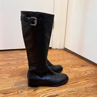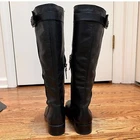 Via Spiga Tall Black Leather Riding Boots Sz 6.5 with Silver Buckle Hardware Good pre-owned condition. Some scuffs to the leather. See pics for details and measurements. Tags: riding, horse, equestrian, preppy, minimalist, neutral, fall, winter
