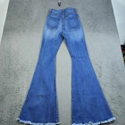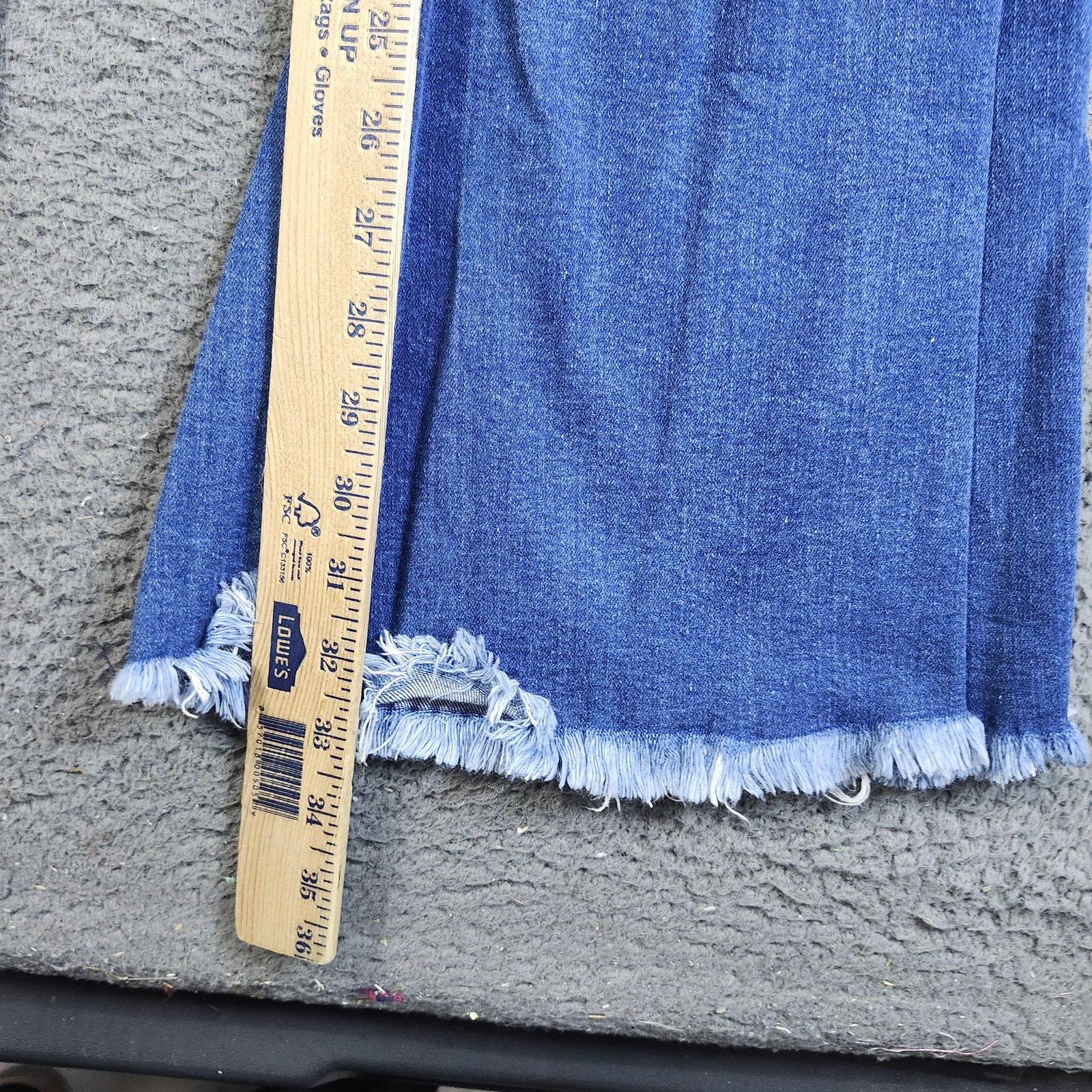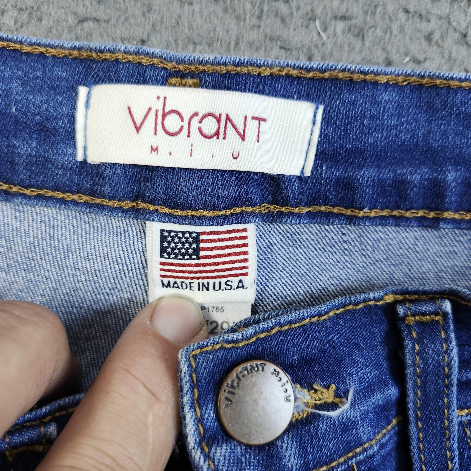 Brand: Vibrant M.i.U Style: Womens high-rise flare jeans with ripped distressing at the knees and frayed raw hem bell-bottom legs. Color: Medium blue wash denim. Size on tag: 11 (W29). Materials (per tag): 72% cotton, 14% rayon, 11% polyester, 2% spandex. Made in U.S.A. Style/Model info on tag: STYLE # P1756, CUT # H68597J, PN # M1701. Details: Five-pocket design, zip fly with button closure, belt loops, fading and whiskering on front and back, Vibrant logo button and back pocket tab.