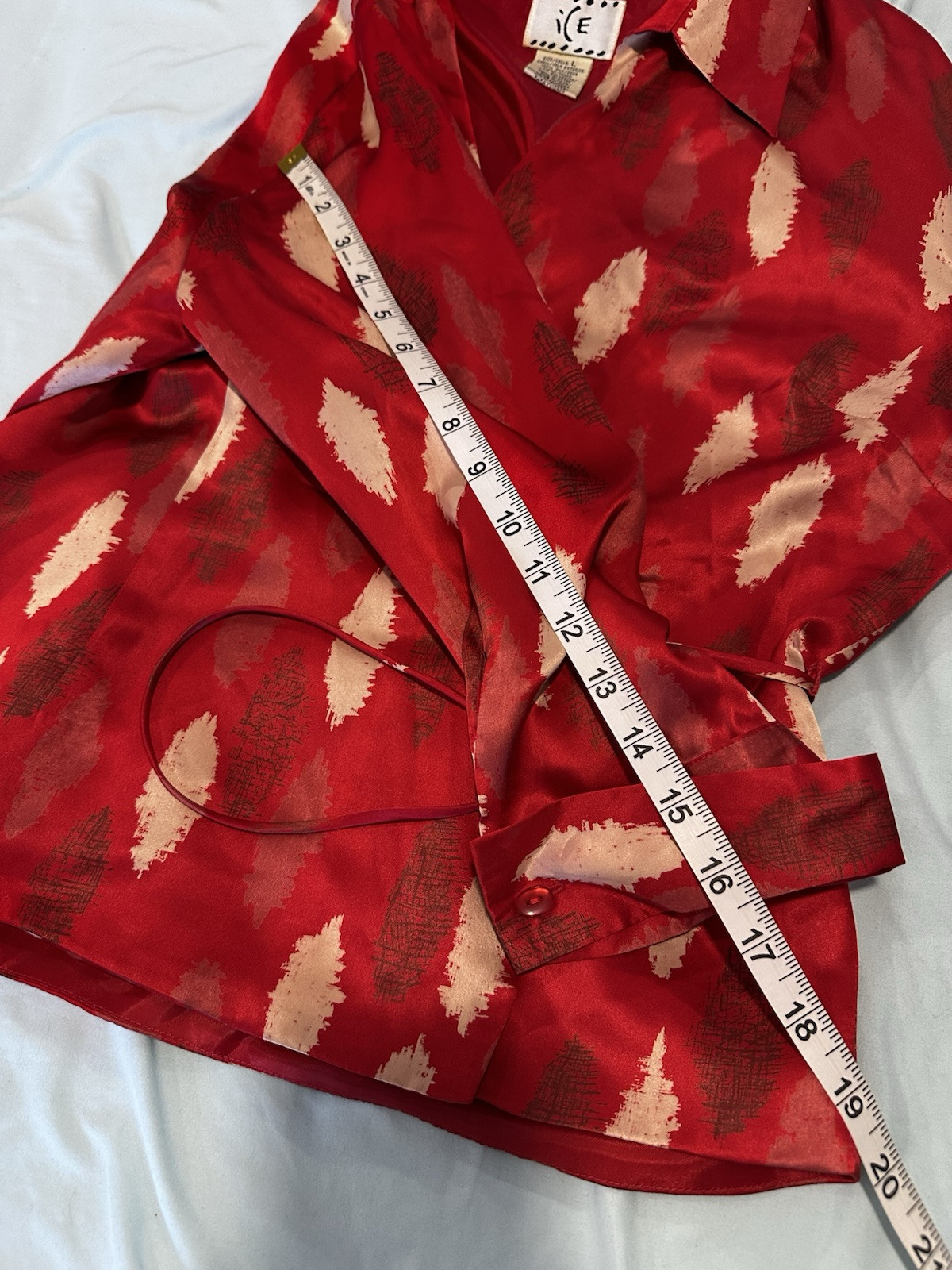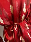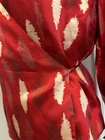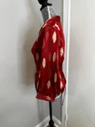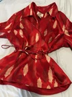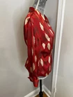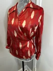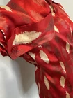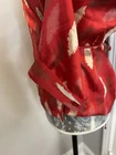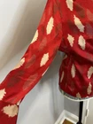 Vibrant Red Silk Wrap Tie Blouse. Abstract Feather. Collared. V Neck. Large. Large spread Collar. Tie back wrap. 100% silk with satin finish. Excellent used condition. No rips, stains or defects. Please see pictures for measurements.