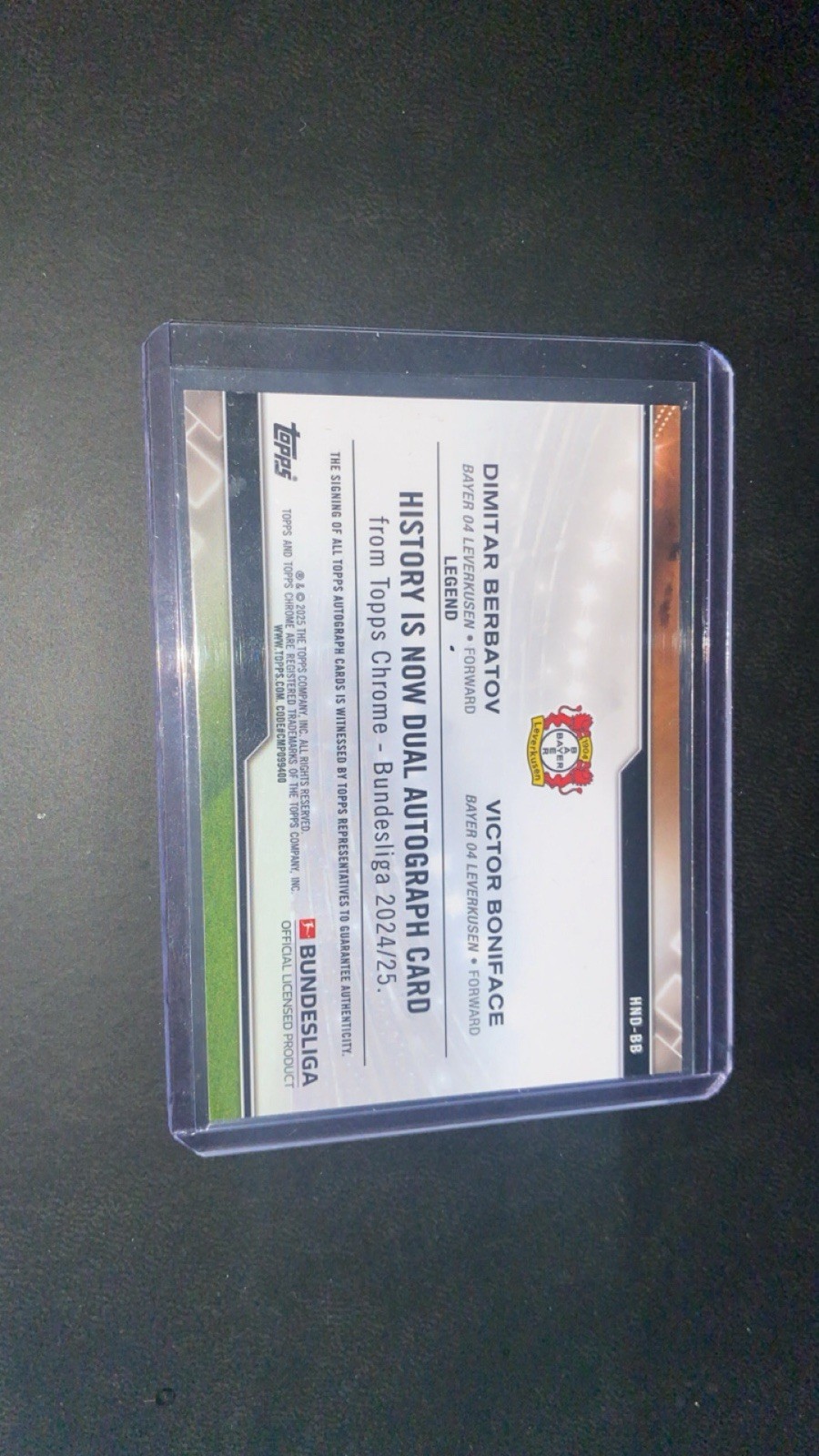 The product is a limited edition Topps Bundesliga Chrome dual autograph card featuring footballers Victor Boniface and Dimitar Berbatov. This collectible card is signed by both players and authenticated by Topps. The card is made of card stock and includes a label or sticker autograph format. A total of only 100 cards are produced, making it a rare and valuable item for fans and collectors of football memorabilia. The dual autograph card is a coveted piece for any football enthusiast looking to add a unique piece to their collection.