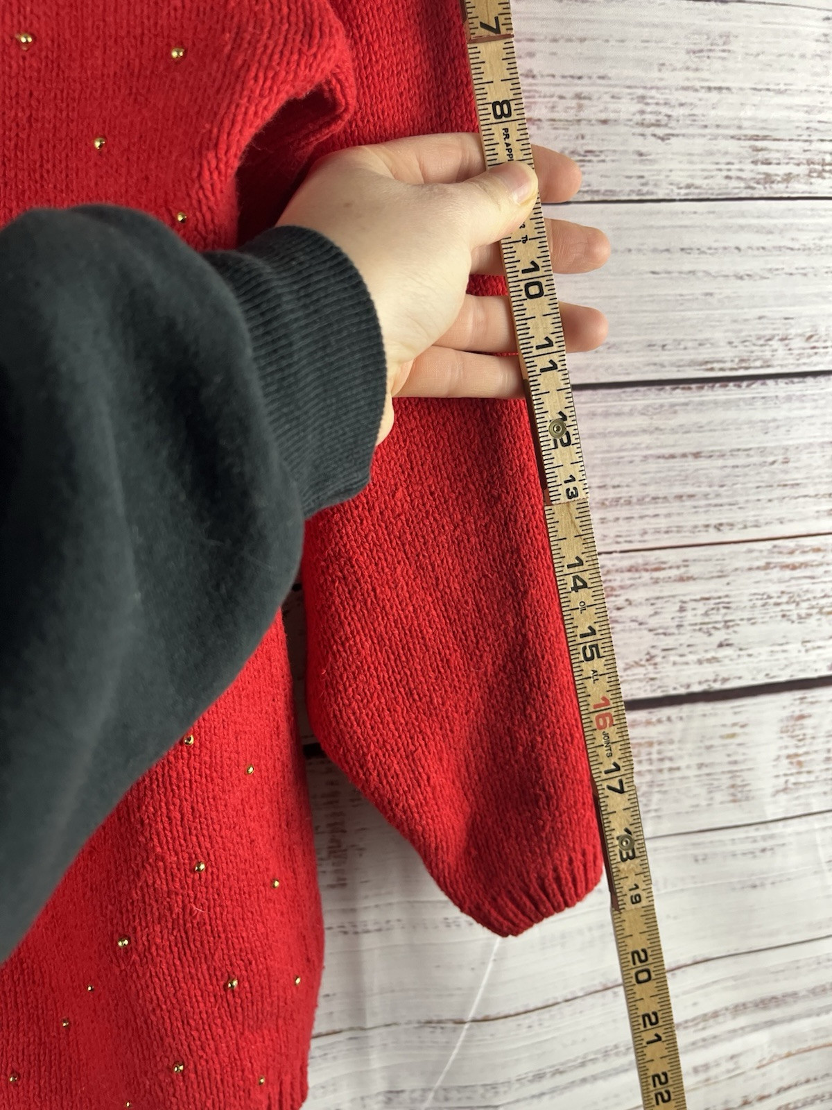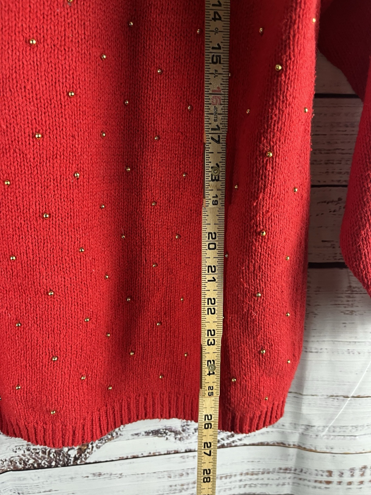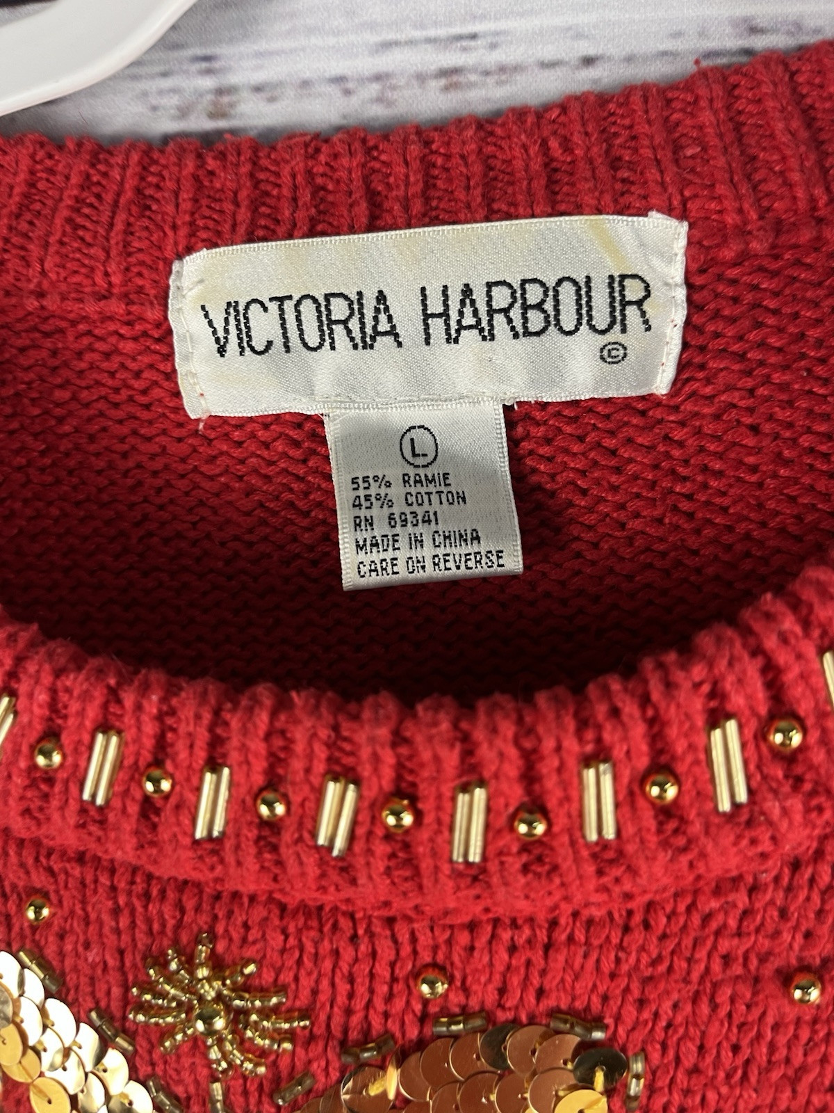 This Victoria Harbour women's sweater in size L features intricate gold embroidery, sequins, and beads, adding a touch of glamour perfect for evening and holiday occasions. The solid red sweater with a round neckline and long sleeves exudes a retro vibe, making it a vintage piece with a unique design. Made of ramie and cotton, this pullover sweater is a stylish and festive addition to any winter or fall wardrobe.