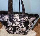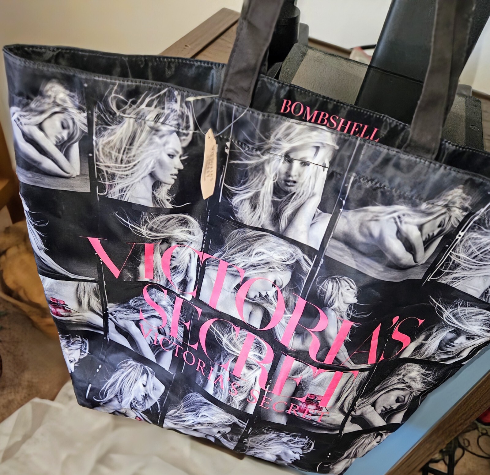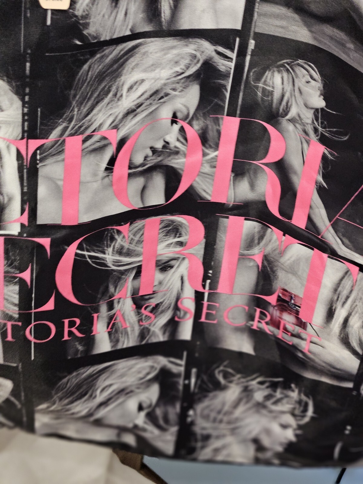 This is a Victoria Secret Large Tote for women, featuring a semi-circle shape with a width of 17 inches and a depth of 8 inches. It is designed with a black polyester exterior and lined with black polyester, making it lightweight and suitable for various occasions such as travel, parties, casual outings, formal events, or business use. The tote includes a shoulder strap for easy carrying, accentuated with strap details and a logo pattern, embodying a love-themed style with Victoria and Angel characters.