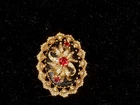 Reminiscent of yesteryear...this lovely 14k gold pendant/pin is set with a center oval tablet of black onyx in an ornate frame. An applied ribbon of gold contains 3 garnets (the larger one in the center and two smaller ones on the top and bottom) and seed pearls. Overall the measurements are 1 3/8" by 1". This is being sold without the chain. Please note the last two photos are done with flash. This was originally selling on consignment at an estate jewelry store (Shelly's) for &1,000. See photo.Since it didn't sell, I'm passing the savings on to you.