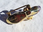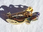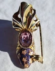 This Raine Brooch " Aladdin" is pretty cool. It reminds me of a lot of things. Witchy, Purple Raine, Victorian or use your imagination. This brooch is 925 Sterling silver with gold plating. Amethyst colored stone. Blue enamel with white stars around toe and heel. This is a cute piece to wear on a jean jacket or hat. This is a pre owned item and the gold overlay has rubbed off in some places still attractive. SEE ALL PHOTOS.