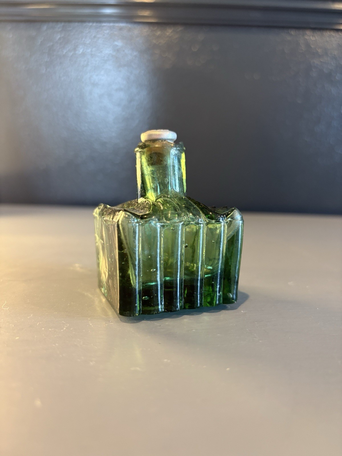 This is a Victorian-era “Aurora” ink bottle, likely a penny ink sold cheaply in the mid-to-late 19th century. The small, square bottle features a ribbed design typical of the period and is made of green glass, a rarer color alongside aqua and teal. Mass-produced and practical, these bottles often show the crude craftsmanship of their era. A charming collectible for antique glass enthusiasts or desk display.