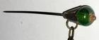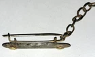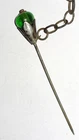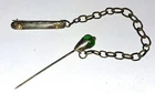 This Victorian bar brooch features a cloak chain with a ball stick pin, embodying antique charm and vintage style. Its green main stone color and original Victorian era design make it a unique and elegant addition to any woman's fashion jewelry collection. A fabulous example of a Victorian cloak pin beautifully crafted. Many from this era are fashioned from Rose Gold, but we haven't cleaned this up enough to make that claim. The dimensional rectangular box pin features a intricately engraved and textured pattern on the top surface. Two raised flat round 'buttons' embellish the design. The main pin is attached to a heavy duty pin with a ball top. They are connected with a heavy duty chain. The stick is steel for strength. All original and in excellent condition with minimal wear. Definitely would benefit from a good cleaning. It closes with a wide safety pin type C catch. The bar pin measures 1.75" by .375" by .25", the stickpin is 3" total, the ball has a diameter of .375" and the chain is 7.25" long. Excellent condition, no damage and minimal wear. The stick has a slight curve which is indicative of use. A fine example of a Victorian cloak pin clasp c1850-70.