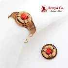 Victorian Bracelet Brooch Pendant Set Carved Coral Roses 14K Gold Antique Victorian 14K (.585) gold set of a bangle bracelet and round form matching brooch/pendant combination. Both items have adorable carved Coral rose centerpiece with a figural ornate flower petals and leaves around. There are also exquisite tiny wire overlay decorations on the bracelet bands and twisted wire rims. This majestic set measures: the brooch is 1 1/4" in diameter; the bracelet is 1 1/4" wide and 6 7/16" long (maximum length), the safety chain is 4" long. Total weight is 23.8 grams. [nb1103] Shipping/Handling/Insurance Policy All items are carefully packed and insured, with no handling or packing fees, ever. Please do not attempt to return an item due to shipping damage. Should it occur in spite of our careful packaging, this must be handled through the shipping agent with an insurance claim. We will be happy to assist in this. Always be sure to retain all original packaging if a claim is to be made as the shipping agent may request to examine it. That being said, in over 10 years of internet shipping, we have had only one damage claim. Shipping is usually done within 24 hours of the receipt of a cleared payment. Shipping may delayed for a few days if we are away from home at an Antique Show. Please feel free to contact us with any inquiries about our items or shipping. We will respond within 24 hours. Any shipping over payments will be quickly refunded. Other Information Sales tax applies for California. A valid resale certificate is required for tax exempt sales shipped to California. International buyers are responsible for all customs fees, duties and VAT.