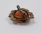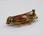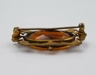 A Victorian brass brooch featuring glass faux citrines. There is some wear to the brass and the pin and frame are slight bent, but overall it looks great for its age! See pictures. It m easures approximately 1 1/2" x 7/8" long. Don't miss out on this lovely Victorian piece!