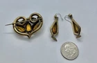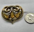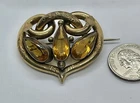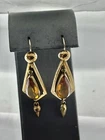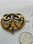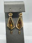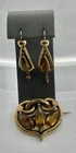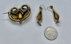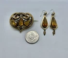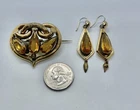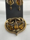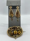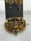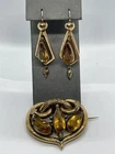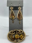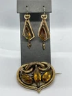 This auction is for a Victorian Brooch & Earrings Engraved Goldtone Metal Orange Citrine Art Glass Set…..the earrings are for pierced ears…..made from gold tone metal - could be gold plate as on the brooch there are some signs of wear where the base metal shows through…..Engraved decorations….Orange citrine rhinestones….earrings have ear wires for pierced ears…… in good condition - slight wear to finish on brooch….the earrings - please look closely at photos and you will see that there is a small faceted drop at the base of each of the main drops - for some reason these are not the same - one is a slightly different shape to the other….the brooch is approx 1 1/2” long and 1 3/4” wide…. the brooch has the tube hinge and C clasp…..the matching fob earrings hang 2” long and 3/4” wide….Preloved and unmarked …..please see all my photos as they are part of my description… I have other jewelry on Ebay and happily combine shipping.. Questions - please email me before auction ends. Winning bidder to pay shipping & handling. .... International buyers will pay at a different rate....Payment is due within 24 hours of auctions end …..THESE TERMS ARE NOT NEGOTIABLE AFTER AUCTION ENDS..... International Buyers – Please Note: * Import duties, taxes and charges are not included in the item price or shipping charges. These charges are the buyer's responsibility. * Please check with your country's customs office to determine what these additional costs will be prior to bidding/buying. * These charges are normally collected by the delivering freight (shipping) company or when you pick the item up – do not confuse them for additional shipping charges. * We do not mark merchandise values below value or mark items as "gifts" - US and International government regulations prohibit such behavior. OTHER IMPORTANT INFORMATION Most of the items I offer are bought on the secondary market and therefore I do not know the history behind them. I strive to purchase and sell only quality items and once they come to my home they are stored in a clean, smoke-free environment. I will do my best to describe each item, pointing out any missing items, minor flaws, etc. however, being only human - there may be an occasion when something has been overlooked. It is never my intention to deliberately withhold information or misrepresent the item in anyway. Please keep in mind these items have been previously owned and are not new. Please review the description and the pictures carefully and if I can answer any questions or provide you with additional photos please do not hesitate to e-mail me before bidding