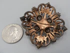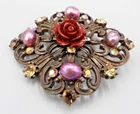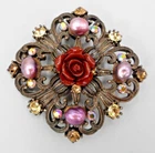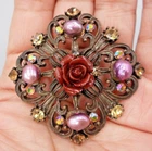 Vintage, copper filigree brooch with a resin rose at its center, a purple potato pearl at each corner of the square and large and small, topaz-colored rhinestones around the edge. The smaller chatons are iridescent. About 1 and 7/8" square. Rolling safety clasp. This pin is being stored in my pet and smoke-free studio. It will be protectively wrapped and shipped in a box .