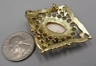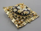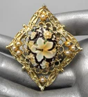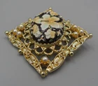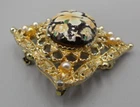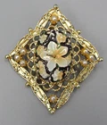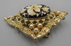 Victorian Revival brooch with a pendant loop on the back. Gold tone filigree set with faux seed pearls and an enameled cabochon. The cab is textured with tropical flowers (hibiscus and plumeria blossoms). 2.25" high by 1 and 7/8" wide. Rolling safety clasp. This pin is being stored in my pet and smoke-free studio. It will be protectively wrapped and shipped in a box .