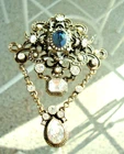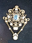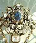 Up for your consideration I am offering a reproduction Victorian style pin brooch featuring a mixture of clear rhinestones, pearls, and a blue sapphire colored stone in the center. Piece has no maker's mark. Very well made. Unsure of age. Measures 4" length x 3" wide. Condition is like new with no damage or stones missing. A beautiful brooch representing the Victorian era. Thank you and please email with any questions.