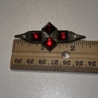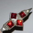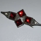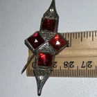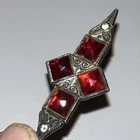 Victorian silver red glass stone scrolling. Both round and square shaped. Set in old silver colored metal. Very old clasp. This is from an estate. It is very old and shows signs of age and wear. The scrolling on the silver is lovely. The stones are vibrant and red. The Old C class is bent and the pen moves to either side. It’s well made, it’s usable, but it’s an antique collectible as well. It’s a nice display piece. It can be worn, but I would be hesitant but as a decoration at Christmas or on a special sweater, it’s stunning. Review pictures carefully for descriptive cosmetic factors.