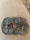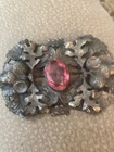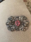 This is a Victorian brooch from England, dating back to the era of 1837-1901. It is silver, featuring a glass jewel pink main stone. The brooch showcases a Victorian nature motif, with intricate handmade details. It is antique, vintage, glass jewel . The piece is customized and bears the brand of England.current market value is $100.- $200 USD