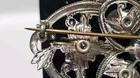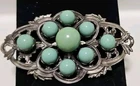 Add a touch of vintage beauty to any outfit with this stunning Victorian design brooch. The asymmetrical shape and filigree details make it a unique piece that is sure to catch the eye. The brooch features faux turquoise cabochons that add a pop of color to any ensemble. Perfect for any occasion, this brooch is a must-have for any fashion-forward woman. The brass base metal and silvertone metal give it a retro feel, while the round main stone shape and turquoise color make it a statement piece. This original Victorian brooch is sure to turn heads and add a touch of fairytale and fantasy to your day.