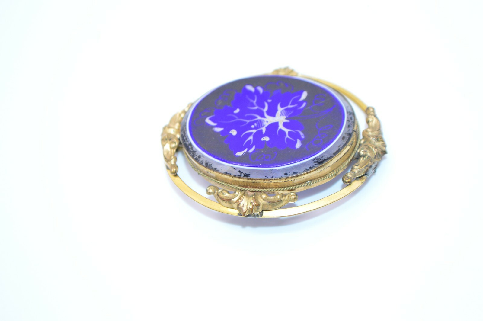 Victorian Gold Filled Blue and White Hand Painted Glass Brooch with C Clasp