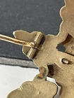 Victorian brooch. (1850–1870 ) The brooch pin and safety chain test out at 14 karat gold. The safety pin is not gold. It has a C clasp and the pin extends .25 inches beyond the clasp. See pictures. There are no missing stones. The pin is thick and heavy. The brooch features a safety pin with chain. The chain test out to 14 karat gold. The stones are rose cut, bohemian garnet. The brooch is 1 5/8 inch wide. There are no hallmarks on the brooch. Please review all pictures prior to purchase. This item is sold as is.