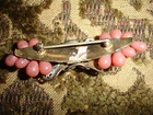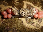 Wonderful Victorian peach colored glass grape clusters centered with a brass filigree design Brooch. Measures 2.5" long.
