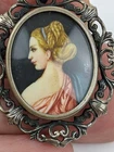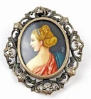 Beautiful antique Art Nouveau early 1900s Hand Painted Portrait Brooch or Pendant combination. The Oval portrait is hand painted and artist signed MG?. It is under a glass crystal and mounted in a wonderful 800 silver filigree frame. This is most likely Italian in origin. It has a locking pin mechanism and a hand chased bail to wear as a pendant. It is clearly marked for 800 silver. The brooch measures 1 3/4" by 1 3/8" and is in excellent well cared for estate condition. The frame has the original appropriate patina. 3202